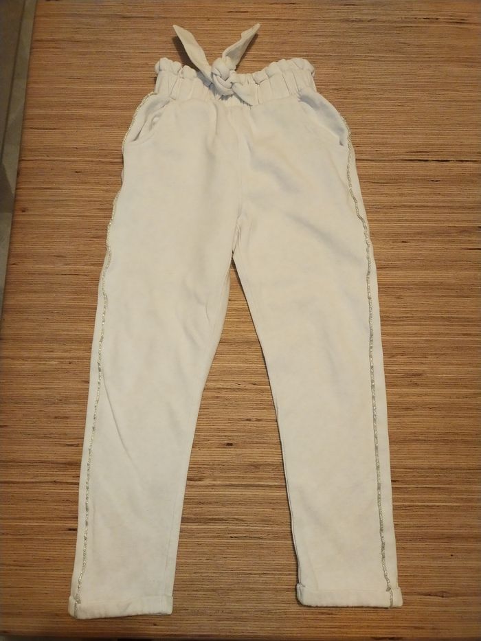 Joli pantalon beige liseret doré le long de la jambe ourlet a la cheville Grosse élastique et ceinture à la taille.