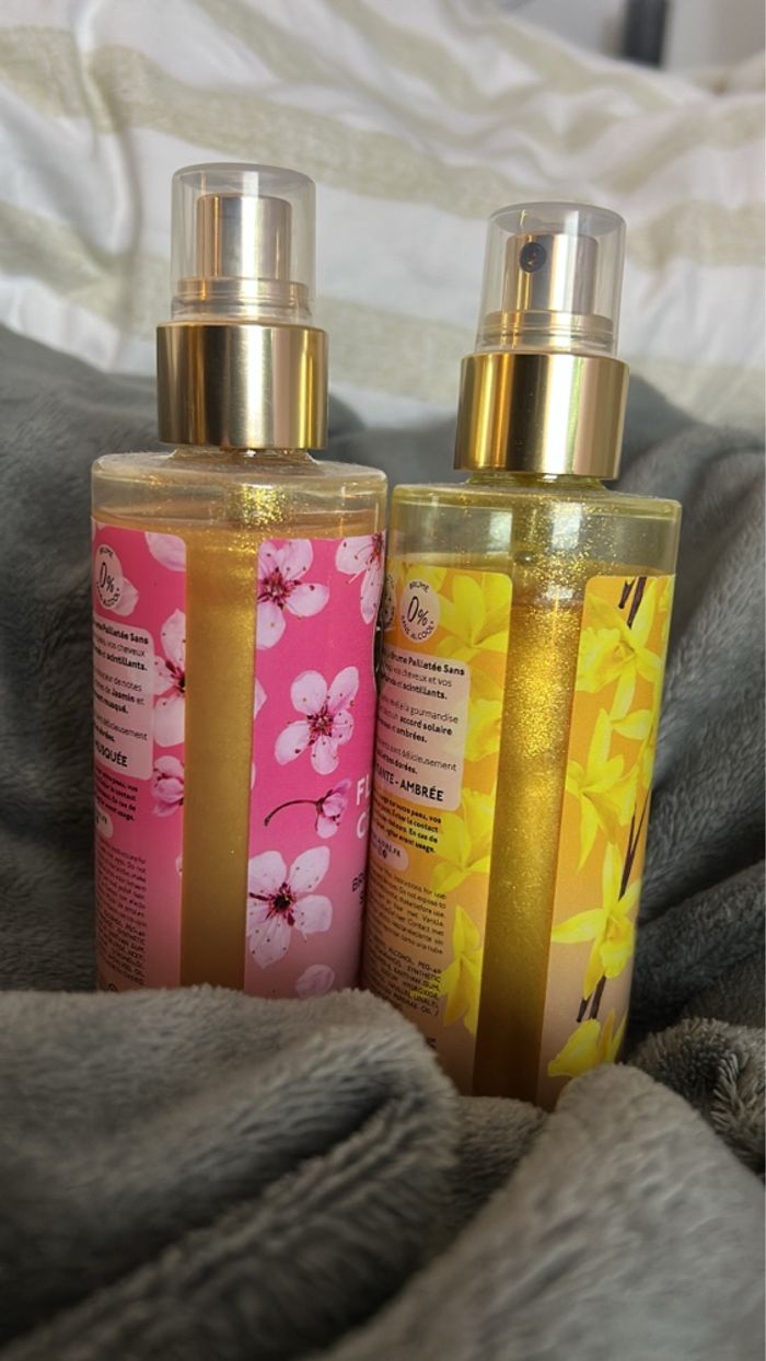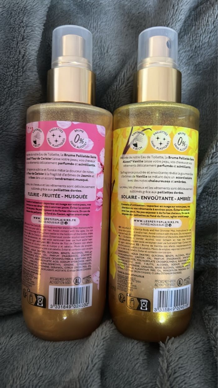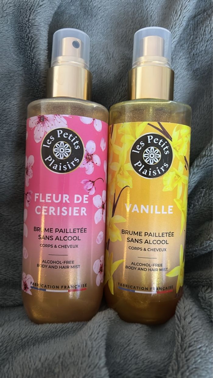 Lot de 2 brumes 200ml pailletées sans alcool de la marque Les Petits Plaisirs: Fleur de Cerisier Vanille ( pshit seulement 1/ 2 fois) Sans alcool Utilisable sur le corps et les cheveux Effet légèrement pailleté Fabrication française