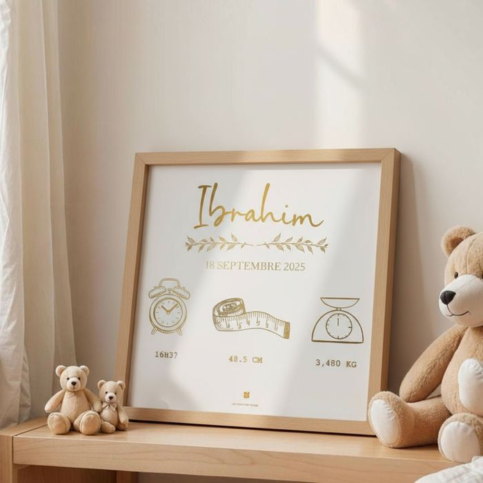 Célébrez l’arrivée de votre bébé avec élégance grâce à notre cadre de naissance personnalisé. Un souvenir unique qui immortalise les plus beaux détails de ce jour inoubliable.🌿 Description : Personnalisation complète : prénom, date, heure, taille et poids Impression haute qualité sur papier épais 110 g/m² Cadre en bois clair, naturel et chaleureux Dimensions : 20 x 20 cm Idéal comme cadeau de naissance ou décoration de chambre d’enfant, ce cadre apportera une touche de douceur à votre intérieur.