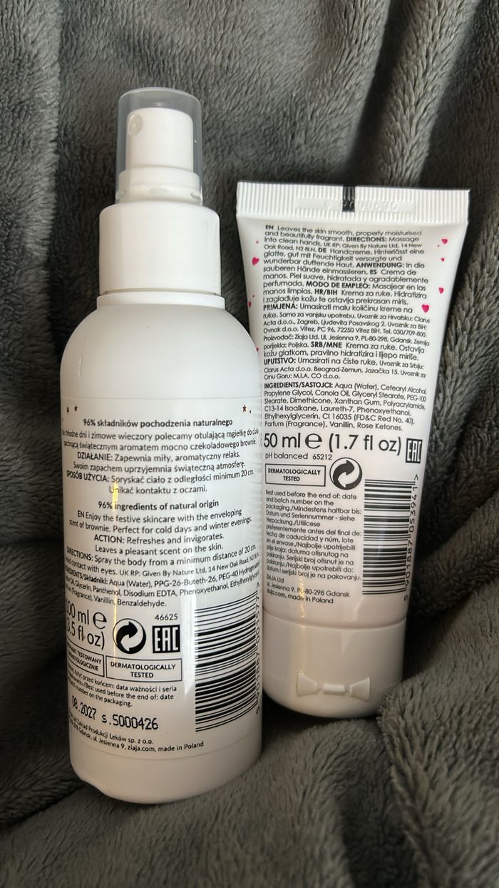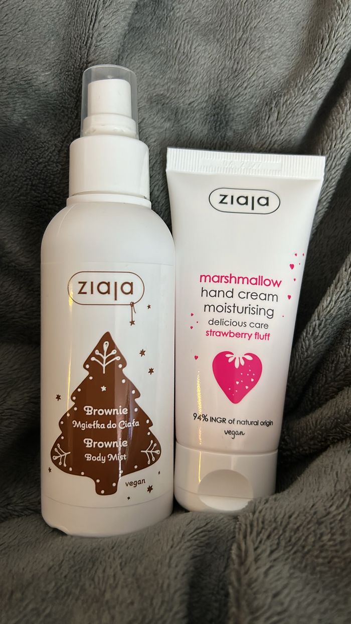 Lot de la marque Ziaja, brume odeur brownie et crème des mains odeurs marshmallow fraise. La brume déjà 2/3 pshit.