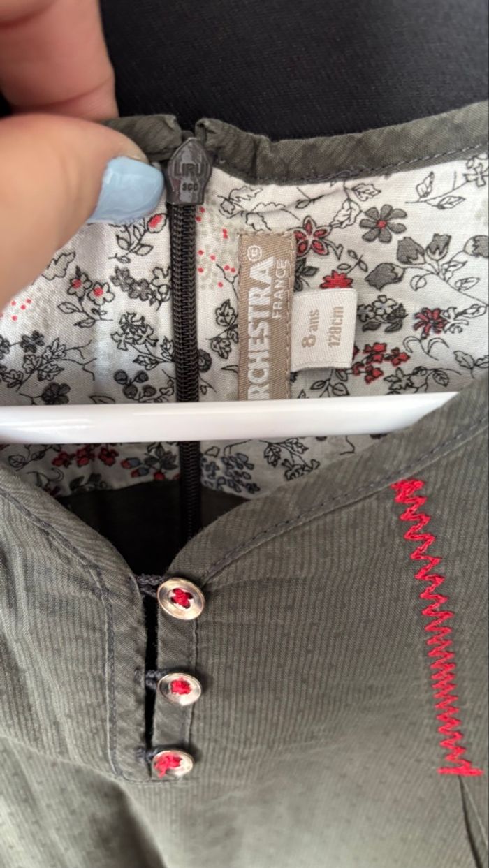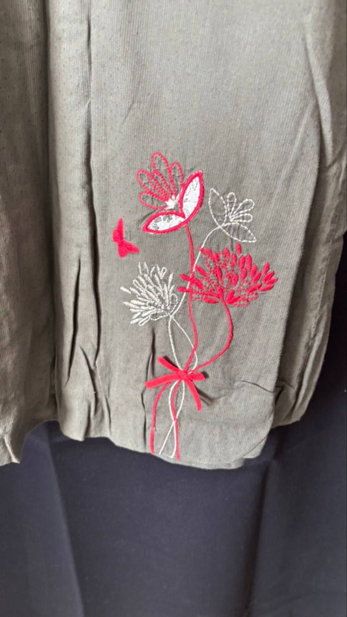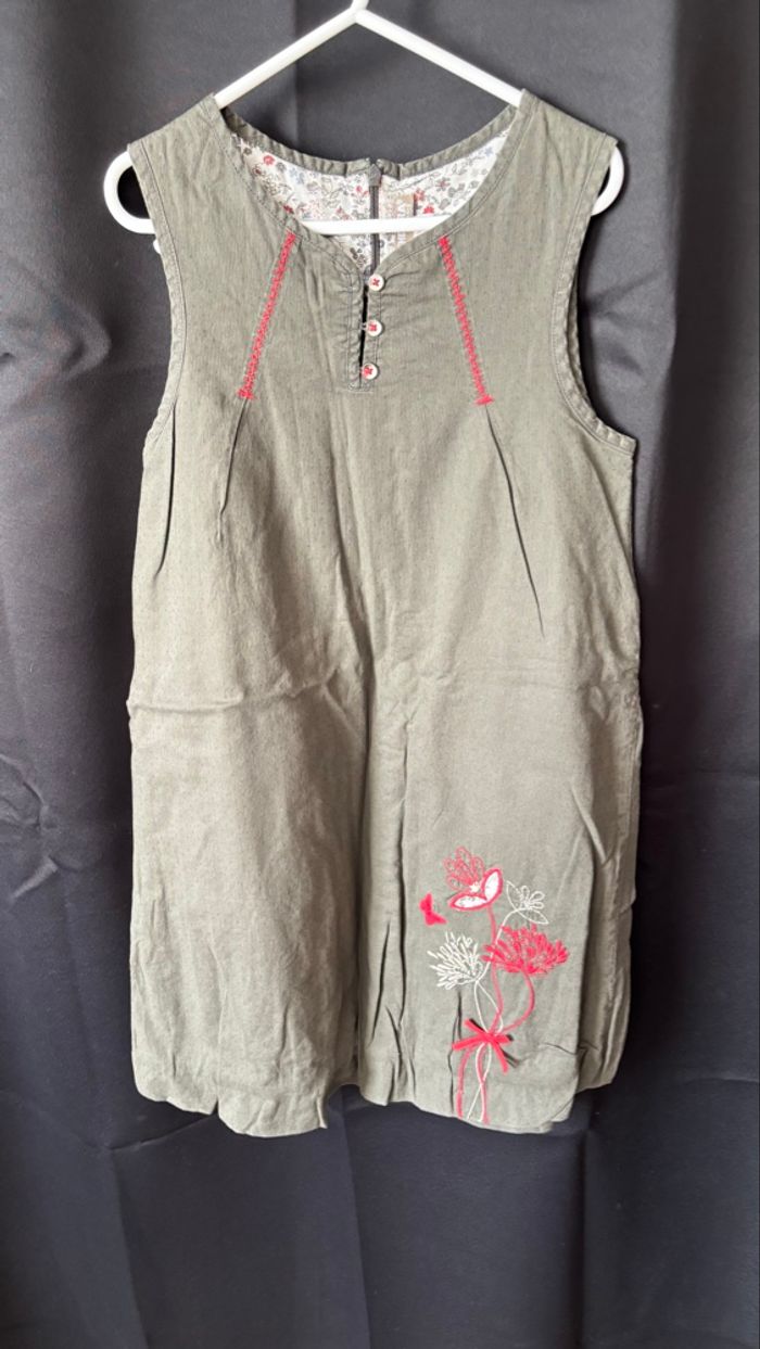 Couleur uni kaki/gris. Très jolie robe avec broderie, fermeture éclair dos et 3 boutons passants sur la poitrine.