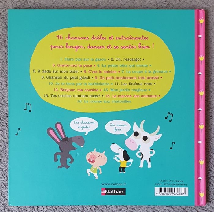 Descriptif : 16 chansons à gestes et à grimaces! Un concentré de bonne humeur à partager! 16 chansons joyeuses et colorées, sur des musiques entraînantes, pour bouger, danser et se sentir bien dans son corps. Est composé des chansons traditionnelles qui font rire les tout-petits (la petite bête qui monte, à dada sur mon bidet, la barbichette, bonjour ma cousine,...). Pour chaque chanson : Des activités de mime, de geste, de chatouilles, de grimaces.. Date de parution : 17/08/2017. Auteur : Gilles Djederichs. Illustratrice : Déborah Pinto. Collection : Livre-CD. Éditions : Nathan. Dimensions du livre : 22,7x22,8Cm. =) 32 pages. Montant d'achat magasin : 13.90E. En très bon état général!