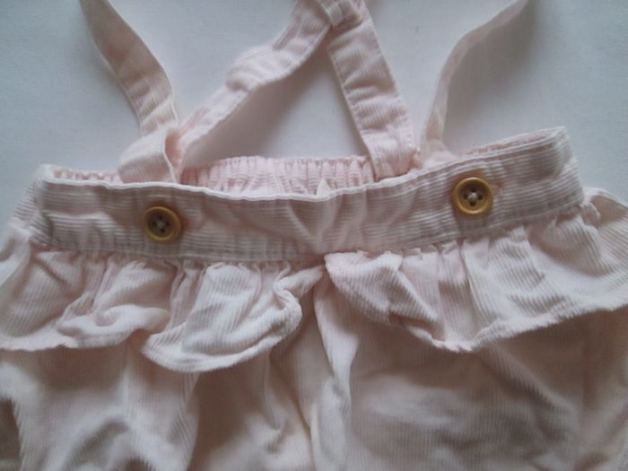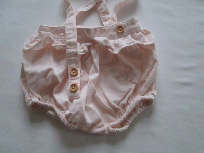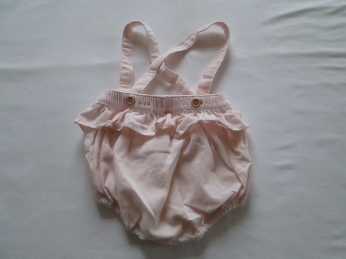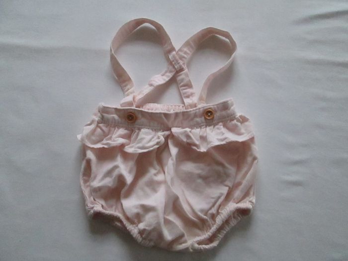 Vends bloomer Cyrillus rose pâle avec bretelles. Taille et cuisses élastiquées. Bretelles croisées réglable et amovibles. Petit volant autour de la taille. 100 % coton. Taille 3 mois. Comme neuf. Pour plus de choix, allez consulter mes autres annonces.