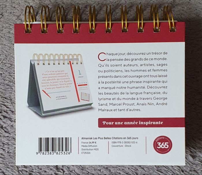 Descriptif : 365 Merveilleuses Citations des plus grands de ce monde! Un Recueil des plus belles citations d'auteurs, de savants, de philosophes, de sages, d'artistes et d'hommes politiques.. Chaque jour, (re)découvrez les citations connues et moins connues des grands écrivains, hommes et femmes politiques, philosophes et artistes qui ont marqué les esprits.. De Charles Baudelaire à Mère Teresa en passant par Mark Twain, Rosa Parks, Victor Hugo, Frida Kahlo ou encore Nelson Mandela, inspirez-vous de leurs citations pour une année riche et épanouie!.. Beau calendrier à spirales. Calendrier sur chevalet - Almaniak perpétuel - 12 mois de janvier à décembre. Éditions 2025. Éditions 365. Dimensions : 140x133x33Mm. Valeur magasin : 14.99E. ⚠️ État neuf mais vendu sans son coffret.