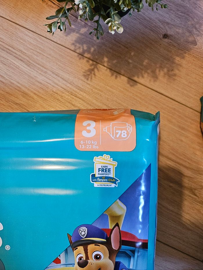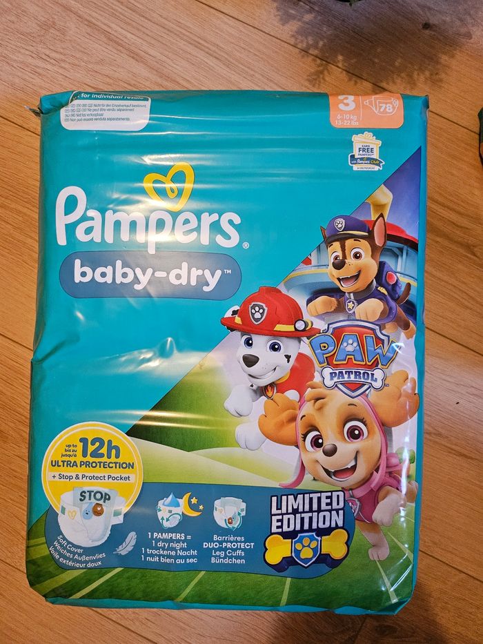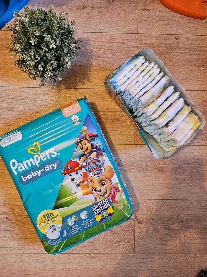 Lot de couches : un paquet de 78 couches + 15 couches supplémentaires offert soit 93 couches au totale Taille 3 de 6 à 10 kg Pat’Patrouille Pampers Baby dry Neuf scellé #fla8bebe #fla8bebe6mois #fla8bebe9mois