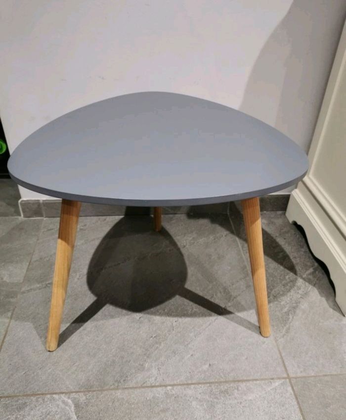 Petite table d'appoint, bout de canapé ou pour toute autre utilisation, en très bon état. Dimensions 42 cm de hauteur et 48 cm de diamètre, de couleur gris clair et pieds en bois.