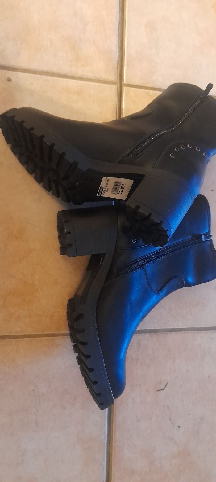 Boots noir neuve jamais porté acheter chez leclerc Encore étiqueté. Prix d'achat 32.90 euros. Talon de 5 cm. Un peu large pour mon pied. Taille 38