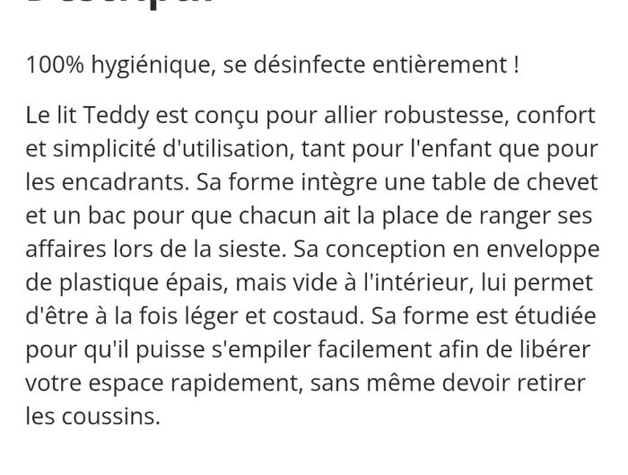 Bonjour Je vends deux lit couchages enfant de la marque Wesco en polyéthylène en très bon état suite à un changement de gamme. Je vends ces deux lits couchages robustes et confortables, idéals pour crèche, assistante maternelle, école, centre de loisirs ou même usage à domicile. Ils sont en polyéthylène épais, très résistants, faciles à nettoyer et adaptés aussi bien à l’intérieur qu’à l’extérieur. 🔹 Dimensions : Longueur : 165 cm Largeur : 70,5 cm Hauteur : 22 cm Poids : 9 kg chacun 🔹 Utilisation Prévu pour matelas 120 x 60 cm (non fourni). Très hygiénique : simple désinfection en surface suffit. Empilables pour un gain de place (jusqu’à 7). 🔹 État Très bon état, pas fissurés, pas abîmés. 💶 Prix neuf : 166 € pièce PRIX DE VENTE ; 70€ PIECES OU 120€ LES DEUX 💬 Vendus sans matelas A venir chercher a Schirrhoffen 👉 Parfait pour professionnels de la petite enfance ou parents recherchant une solution solide et durable.