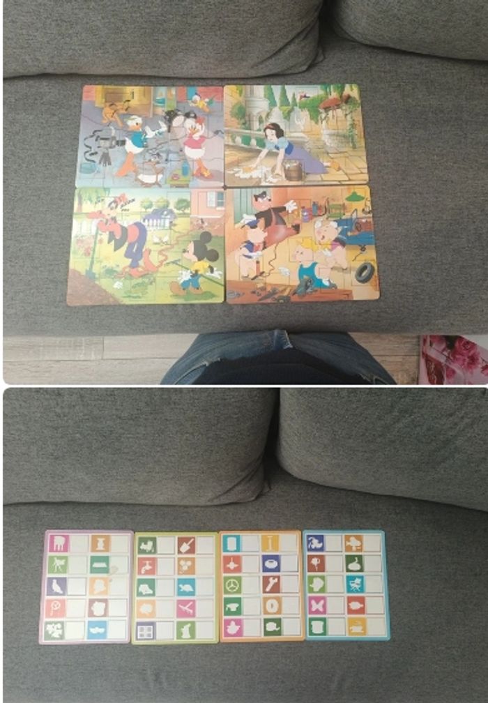 Deux jeux d'observation 4 planches Loto avec un côté scène et 10 silhouettes de l'autre Bon état Boîte tâché
