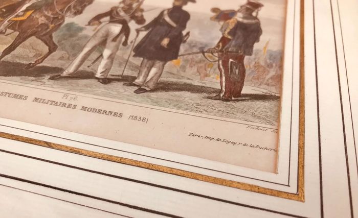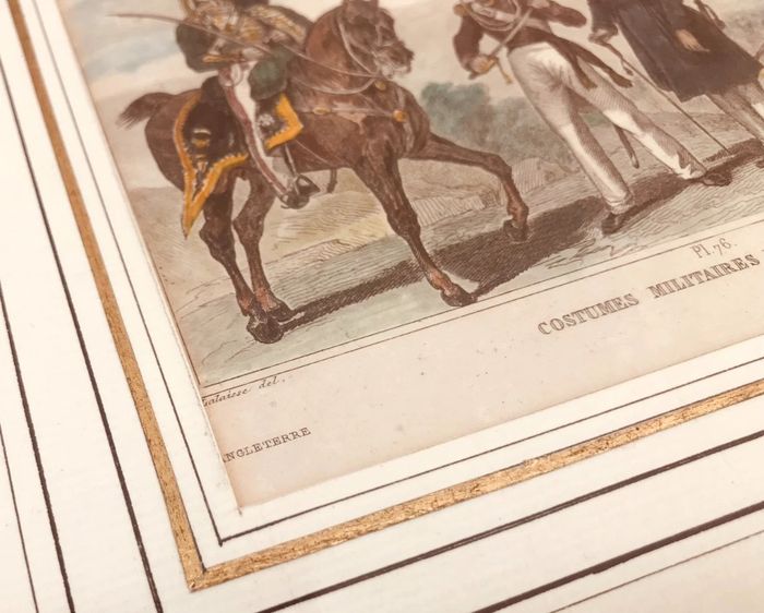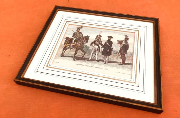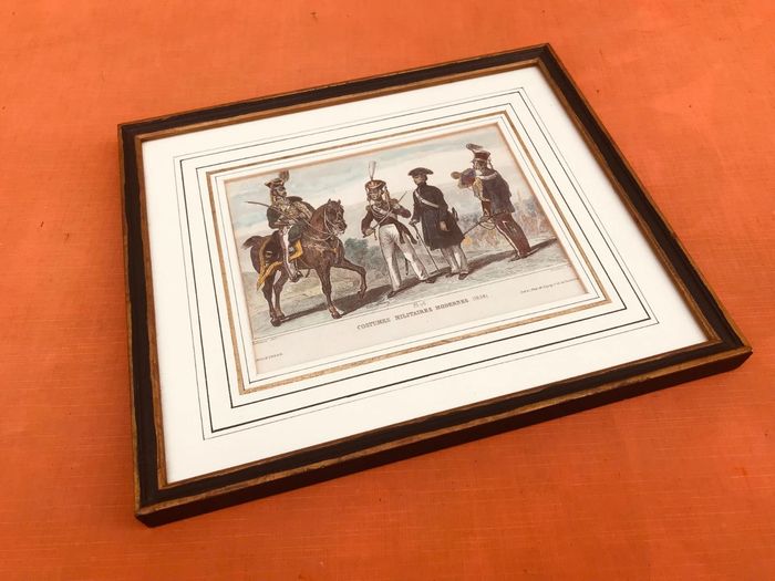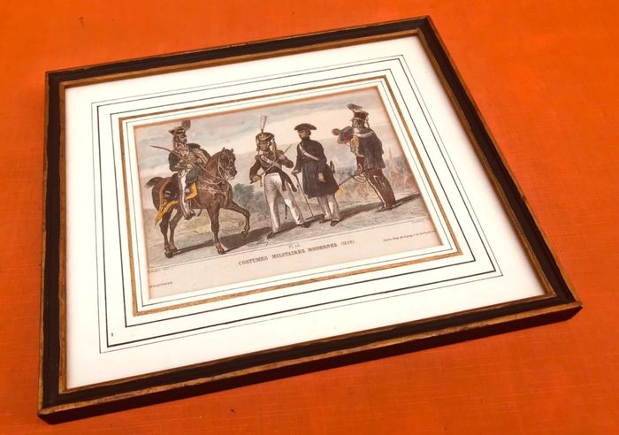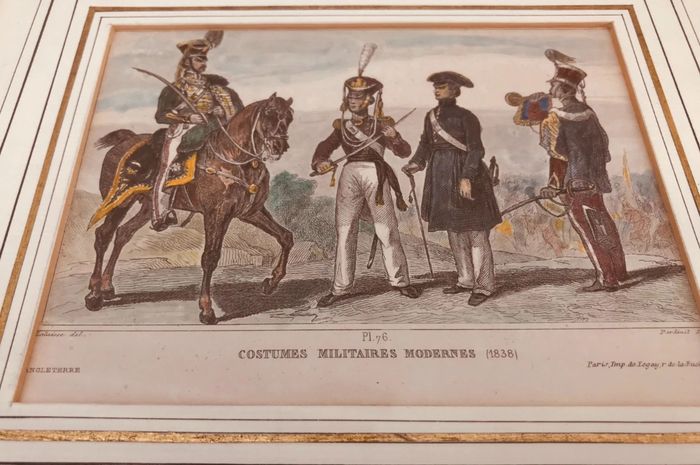 Ancienne gravure à suspendre Costumes Militaires Modernes Angleterre 1838 D' après Lalaisse Gravée par Pardinel Encadrement bois sous verre Montée sous passe-partout Longueur : 245mm Largeur : 210mm Hauteur : 15mm Poids : 455grs