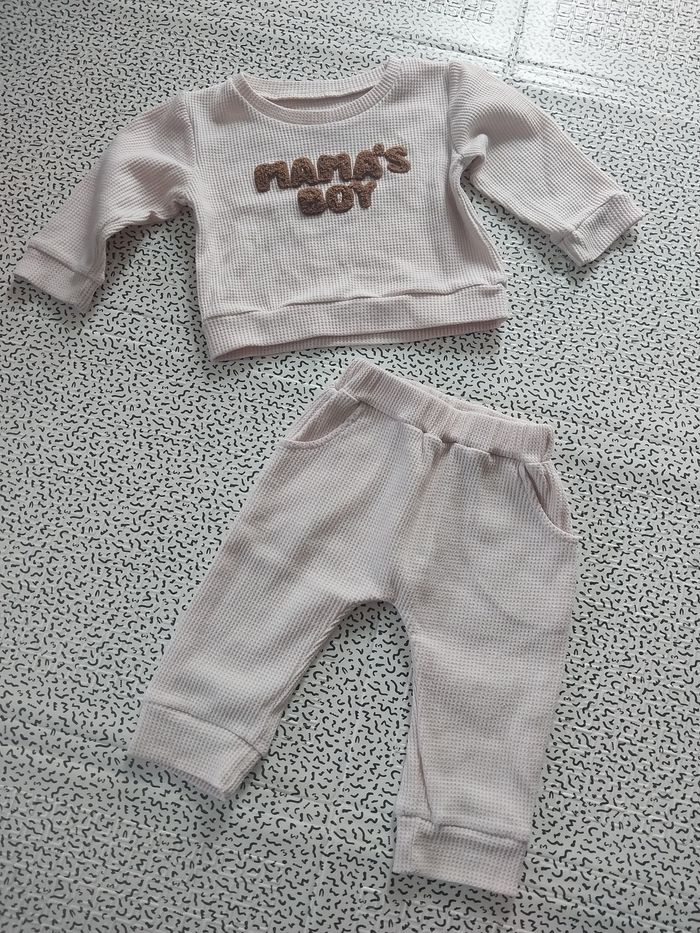 ensemble bébé “Mama’s Boy” – 2 pièces (haut + pantalon) texture pique waffle gaufré, doux et confortable couleur beige/nude + broderie bouclette Mama’s Boy taille 70 (≈ 6–9 mois selon morpho) très bon état, porté peu matière 65% polyester – 35% coton ensemble idéal mi-saison / intérieur / photos / cadeau naissance 📦 État Très bon état : pas de tache, pas de trou, pas de bouloche. Coupe confortable, taille élastique, poches pantalon. 🧺 Entretien lavage machine doux – sèche-linge possible basse T° 📍 Note taille Taille 70 = environ 6-9 mois (guide indicatif) #mamasboy #ensemblebebe #6mois #9mois #tenuebebe