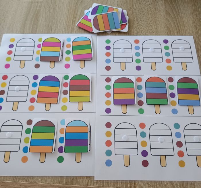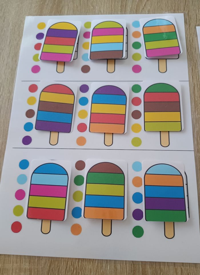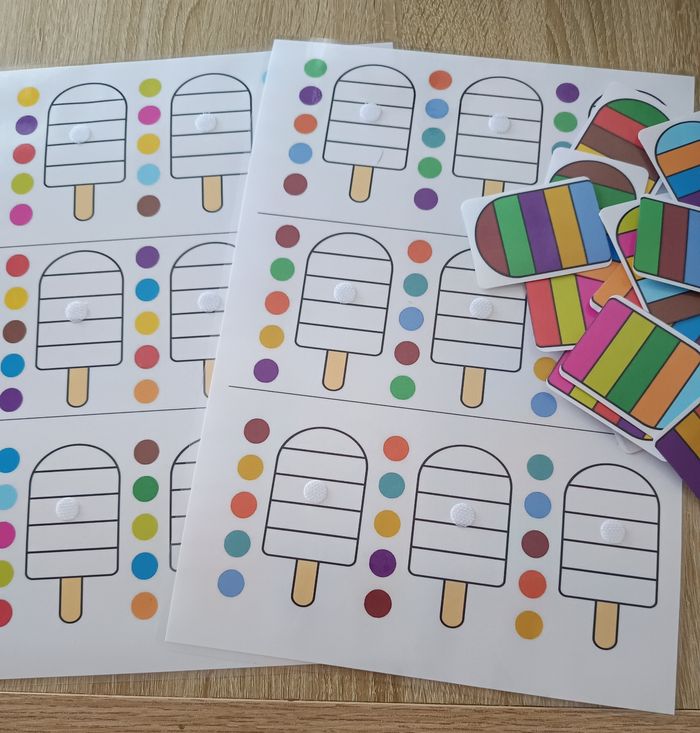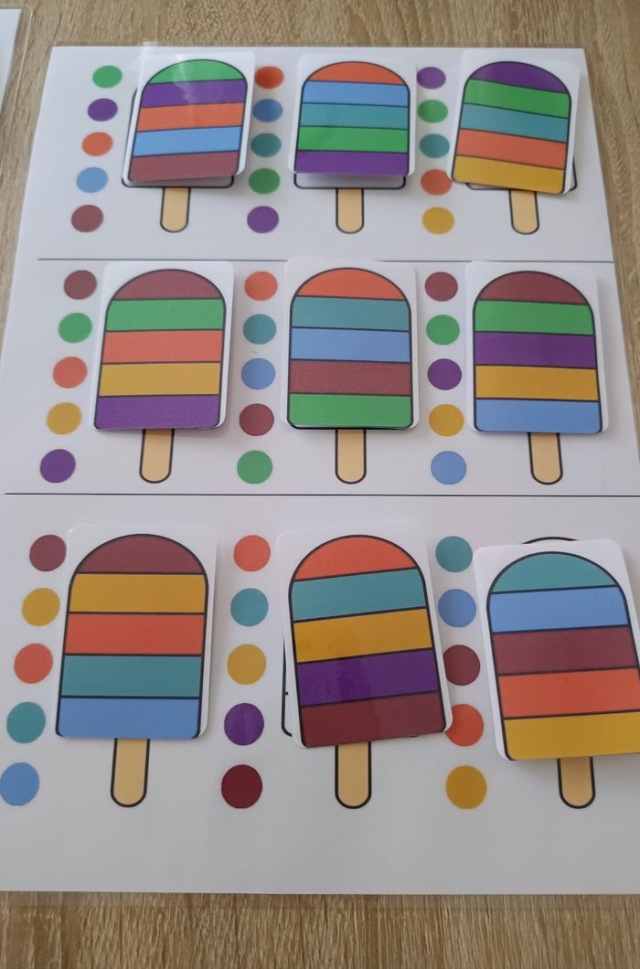 Voici un jeu éducatif Montessori pour apprendre l'association des couleurs ainsi que l'ordre de rangement ! Ce jeu coloré et ludique comprend 18 glaces dans différentes teintes. Les enfants peuvent s'amuser en assemblant les bonne combinaisons de couleurs. Idéal pour les tout-petits à partir de 3 ans, ce jeu Montessori favorise l'apprentissage par le jeu et la manipulation. Parfait pour stimuler la curiosité et l'éveil des jeunes enfants, il deviendra rapidement un favori dans votre maison ! - Confectionner à la commande. - Pochette refermable fourni. D'autres activités sur mon profil.