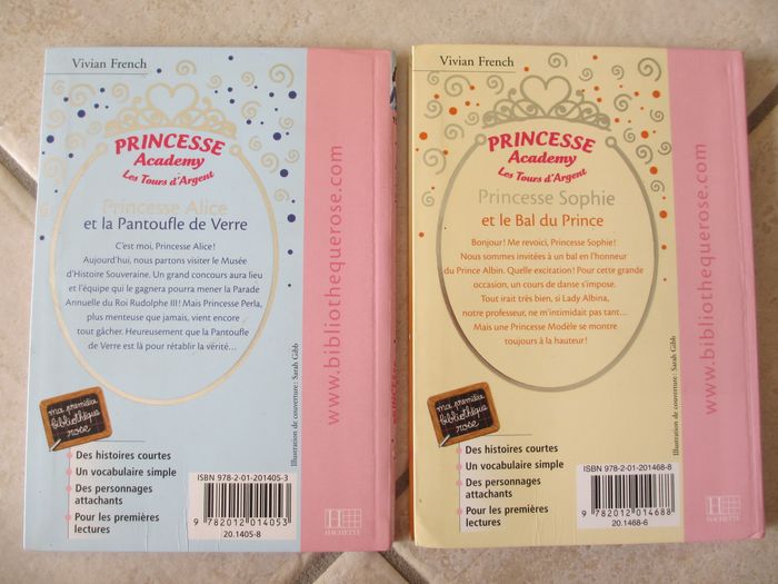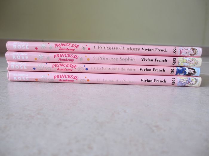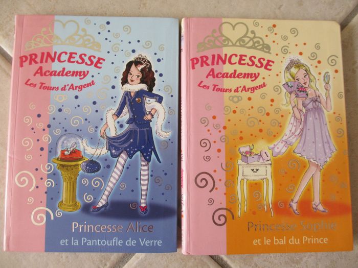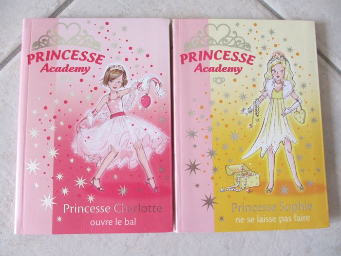 Lot de 4 livres enfant Princesse Academy (Bibliothèque rose). Dès 6 ans. - Tome 1 : Princesse Charlotte ouvre le bal - Tome 5 : Princesse Sophie ne se laisse pas faire - Tome 10 : Princesse Alice et la Pantoufle de Verre - Tome 11 : Princesse Sophie et le bal du Prince Très bon état. 8 € le lot de 4.