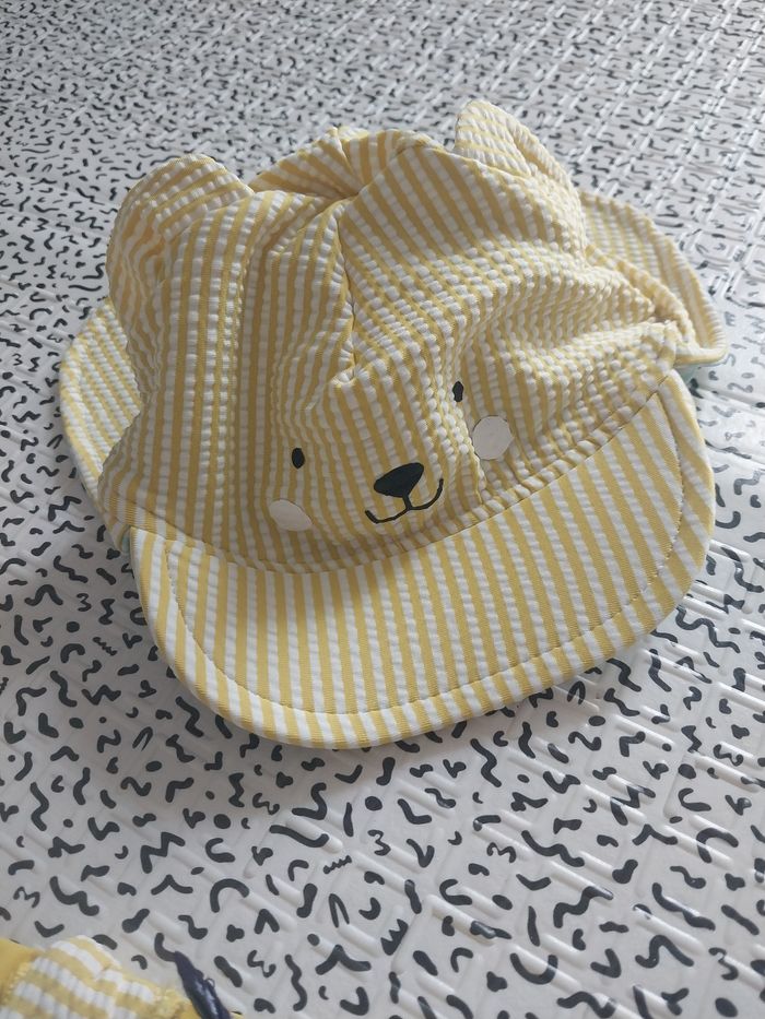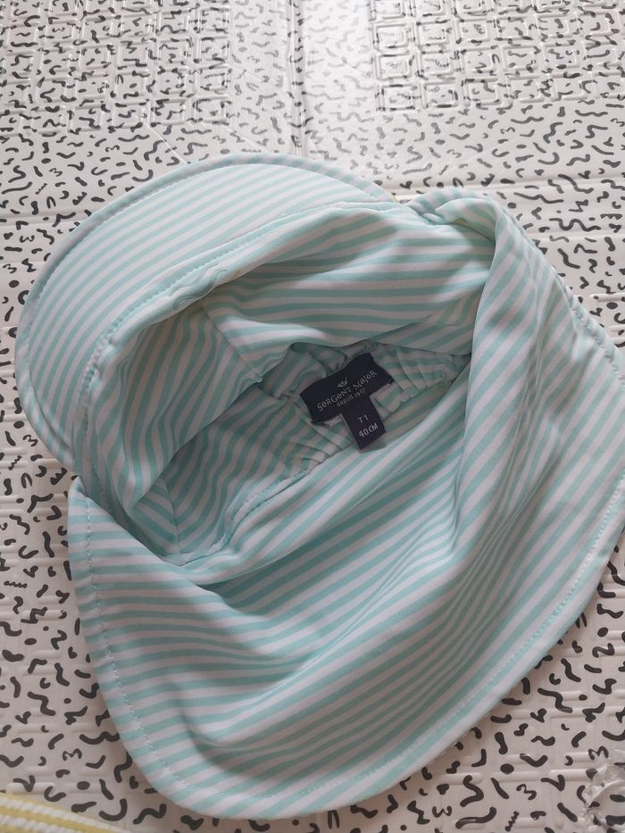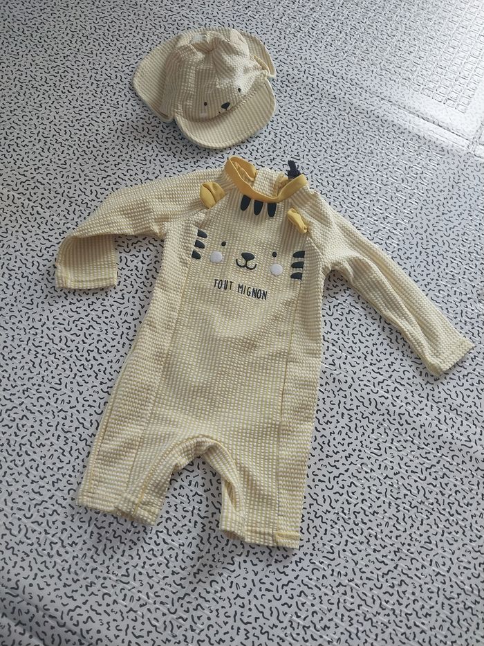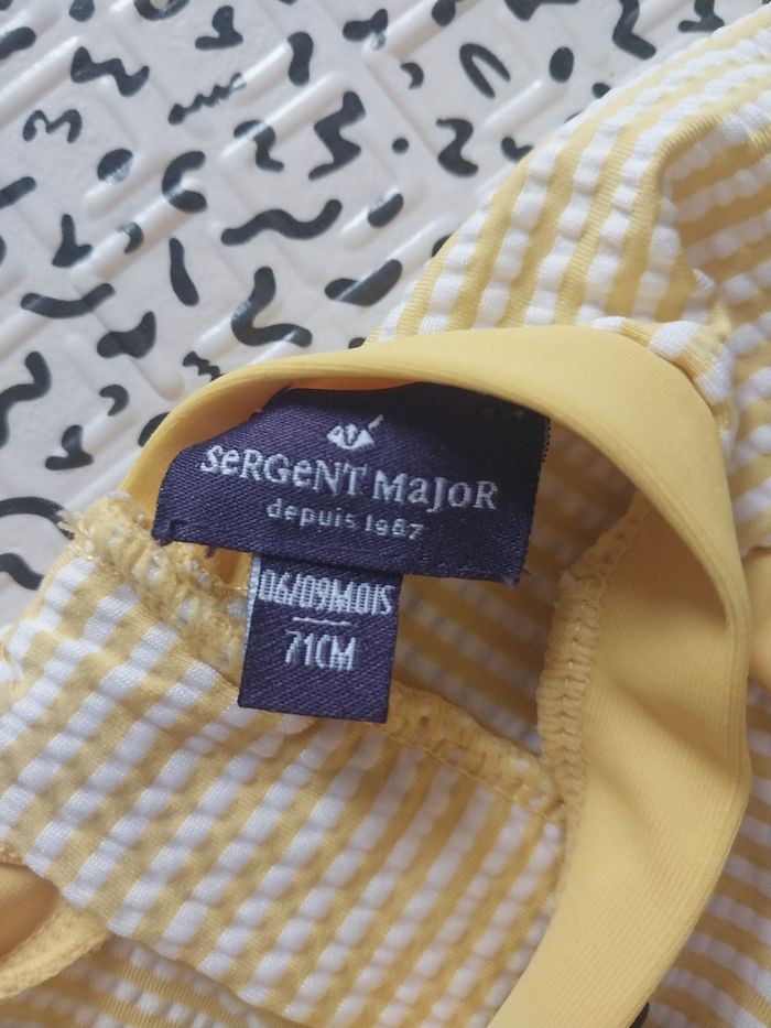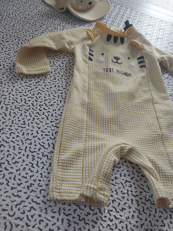 Adorable ensemble Sergent Major, motif tigre « Tout mignon ». Comprend : ✔ combinaison anti-UV manches longues ✔ casquette assortie avec petites oreilles Couleurs jaune rayé, détails brodés. Taille 6-9 mois (voir étiquette). Très bon état, porté peu — idéal été, plage, piscine et vacances ☀️ Maison non fumeur. Photos conformes. #sergentmajor #antiuv #maillot #combinaison #6mois