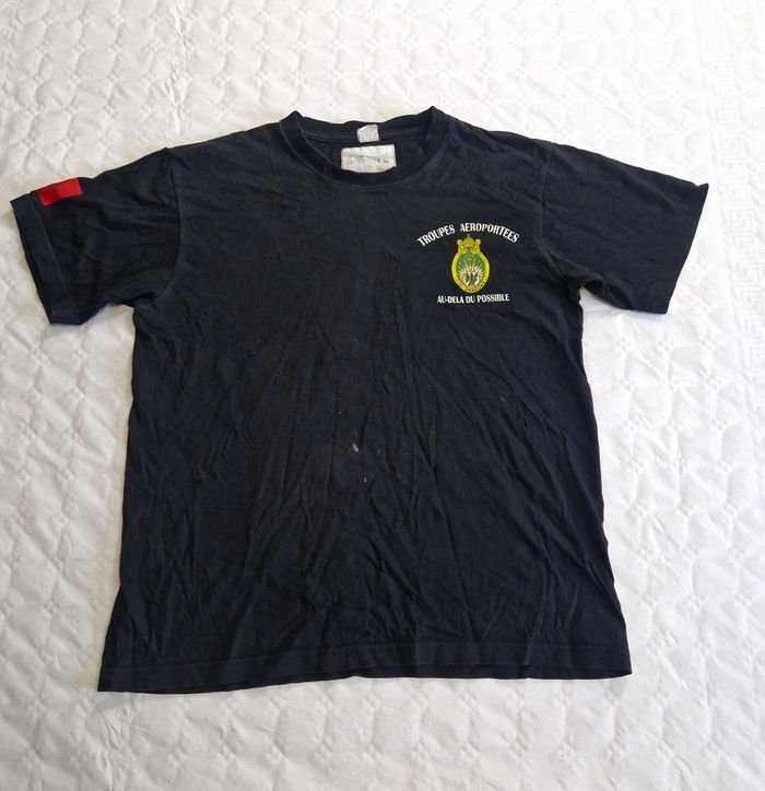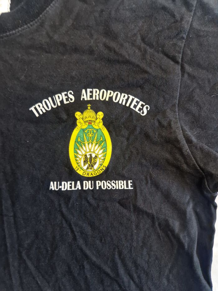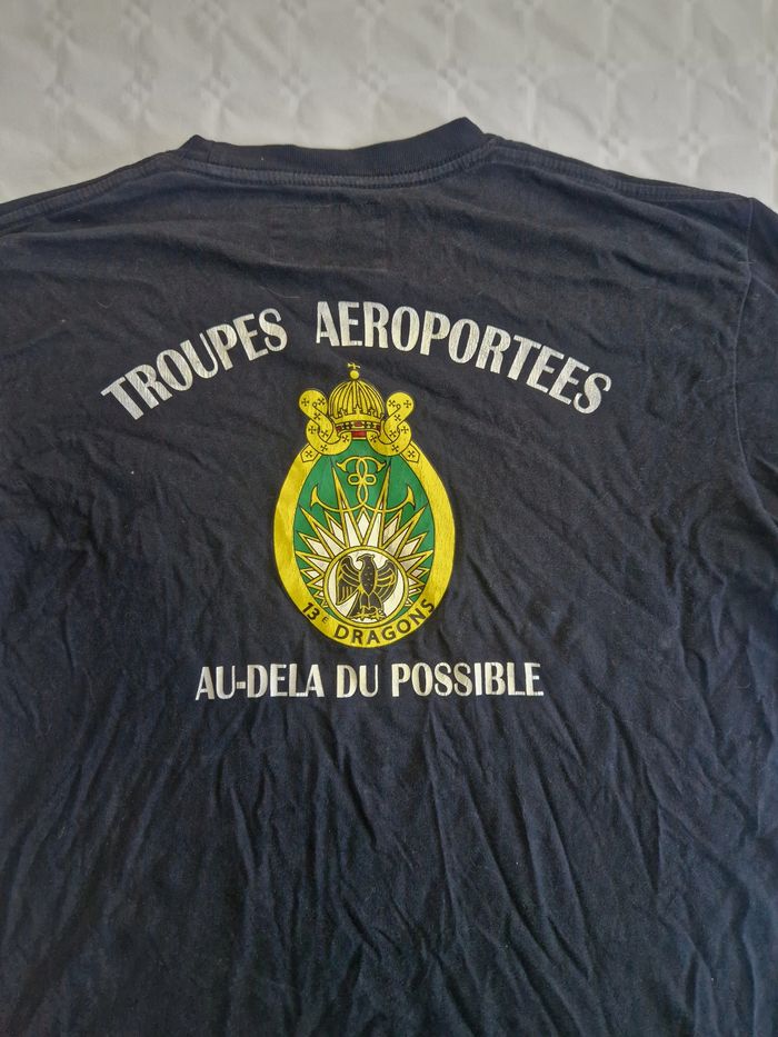 PIÈCE COLLECTOR - 13e RÉGIMENT DE DRAGONS PARACHUTISTES (13e RDP) ​Vends t-shirt de tradition authentique du prestigieux 13e RDP, l'unité d'élite du renseignement des Forces Spéciales françaises. ​Époque : Fin années 90 / début 2000 (Période où le régiment était encore basé à Dieuze). ​Marque : Para Trooper Inc (Fournisseur historique des foyers militaires). ​Détails : ​Dos : Grand blason "Dragon de l'Impératrice" avec la devise "Au-delà du possible". ​Cœur : Rappel du logo et mention "Troupes Aéroportées". ​Manche : Drapeau tricolore sérigraphié. ​État : Bel état vintage malgré quelques petites taches de peinture ( visible en photo ) . La sérigraphie du drapeau sur la manche est craquelée, ce qui lui donne un aspect "authentique" et prouve son âge. Le noir est légèrement patiné, parfait pour un look militaire rétro. ​Matière : 100% Coton épais de qualité, col bord-côte élastique robuste. ​Pourquoi cette pièce ? Ce n'est pas une copie moderne. C'est un t-shirt qui a connu la transition du régiment vers les Forces Spéciales. Idéal pour collectionneur de militaria ou pour un style streetwear vintage affirmé. Taille M ​#13RDP #ForcesSpeciales #Militaria #VintageArmy #Parachutiste #TAP #Dieuze #Dragon #StreetwearVintage #ParaTrooperInc
