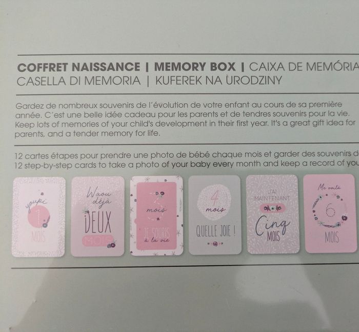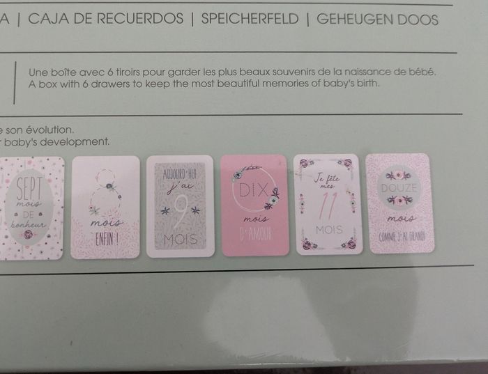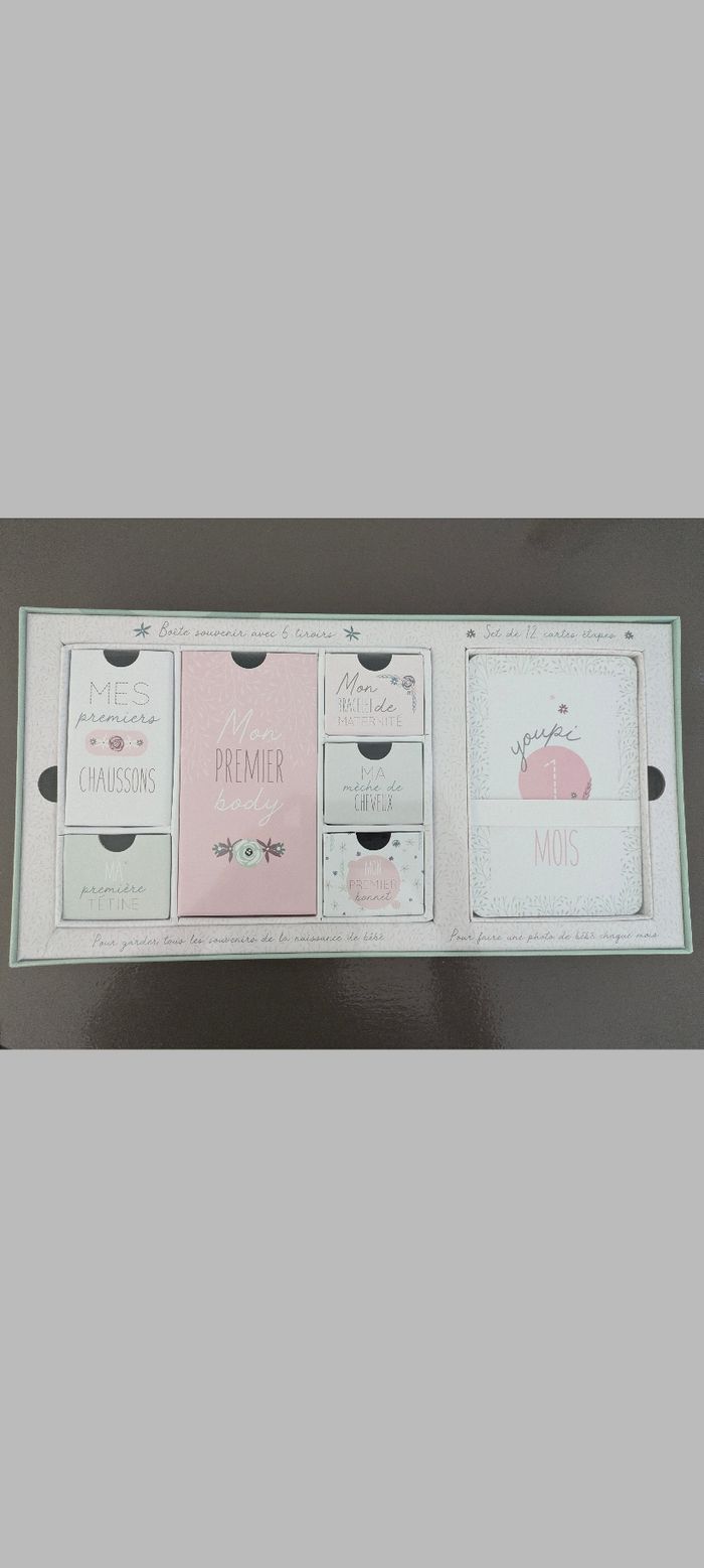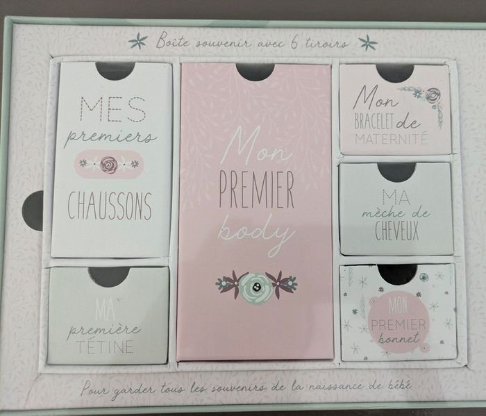 Coffret cadeau de naissance "mon premier" rose Vos souvenirs dans un écrin Composée de 6 tiroirs, cette boîte rectangulaire en carton conservera toutes ces petites choses précieuses collectionnées au fil des premiers mois de bébé. Que ce soit son premier chausson, son bracelet de maternité ou encore sa mèche de cheveux, vous les aurez toujours à portée de main. Un cadeau original Avec ses inscriptions et motifs tout doux, ce coffret de naissance sera idéal à offrir ou pour vous faire plaisir ! Il comprend également 12 cartes étapes, ce qui vous permet de prendre une photo de bébé chaque mois... et de constater à quel point votre tout-petit grandit vite ! Neuf sous emballage