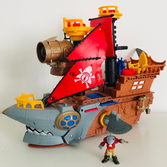 Je vends un grand bateau qui roule, avec un pirate requin et balle, en bon état. Plusieurs cachettes dans le bateau et lorsque le pirate monte sur les plateformes rouges il peut lancer la balle, ou ouvrir une cachette sur le côté du bateau ou ouvrir lavant du bateau selon la plateforme sur laquelle il est. Prix neuf: 69,90€