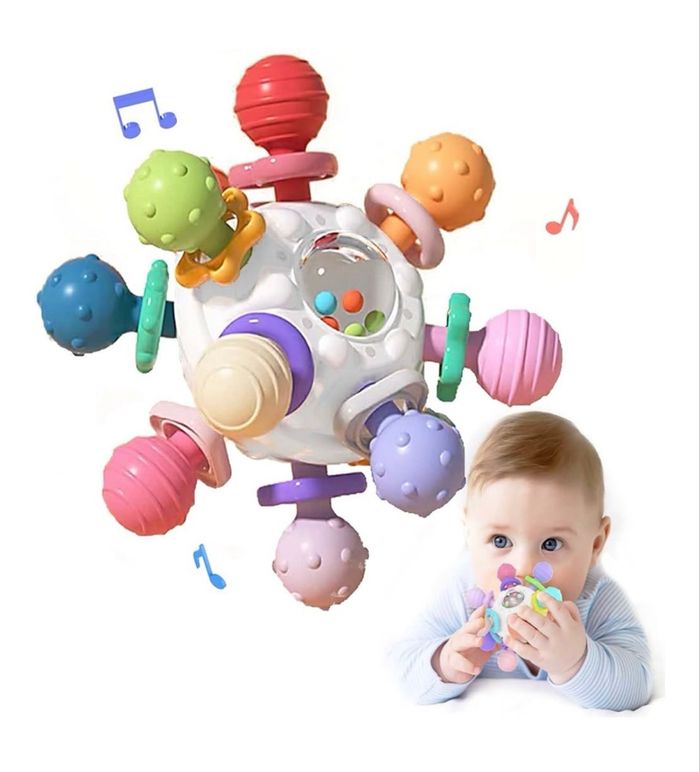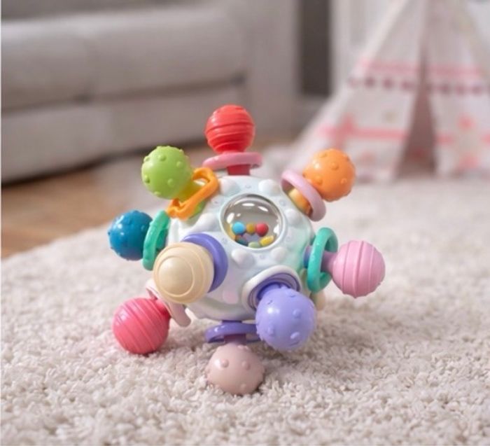 Balle d’éveil sensorielle multicolore, idéale pour accompagner bébé dans ses premières découvertes 🍼✨ Pensée pour les petites mains, elle est légère, facile à attraper et parfaitement adaptée aux tout-petits. Ses formes ajourées, ses textures variées et ses couleurs douces et contrastées stimulent les sens de bébé tout en favorisant la motricité fine. Les petites billes intégrées produisent un son léger qui attire l’attention sans être agressif. Un jouet simple, ludique et éducatif, parfait pour les moments de jeu à la maison ou en déplacement. ⸻ ⭐ Les + pour bébé • Stimule la vue, le toucher et l’ouïe • Favorise la coordination œil-main • Encourage la motricité fine • Facile à saisir et à manipuler • Matières adaptées aux bébés (sans BPA) 📦 État Neuf ⸻ 🎁 Idéal pour • Bébé dès la naissance • Cadeau de naissance • Jouet d’éveil du quotidien