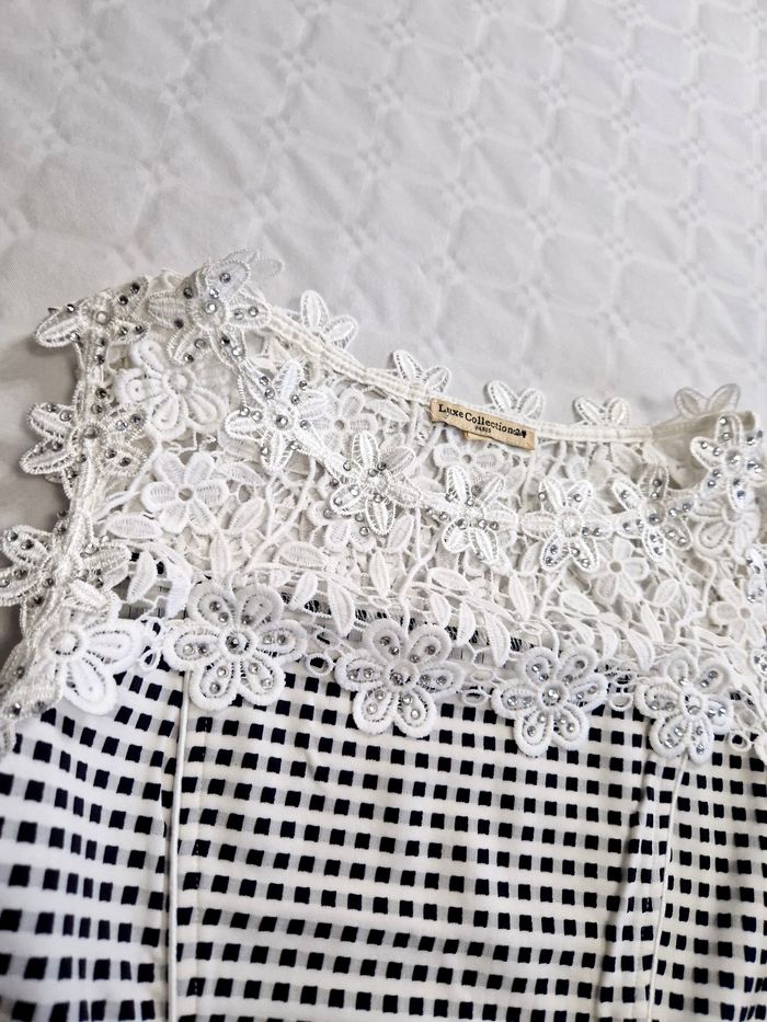 Coup de cœur pour ce haut élégant de chez Luxe Collection Paris, parfait pour une occasion ou une soirée. ​Design : Magnifique plastron en dentelle blanche avec détails floraux et strass étincelants. ​Motif : Imprimé vichy noir et blanc indémodable. ​Coupe : Cintrée grâce à des découpes structurantes sur le buste. ​Taille : Pas d'étiquette de taille, mais correspond à un 36/S ​Mesures : Largeur aisselle à aisselle : 38 cm. (Vérifiez bien par rapport à l'un de vos vêtements). ​État : Excellent état. ​Un haut très féminin qui se marie parfaitement avec une jupe crayon ou un pantalon noir ajusté. ​✨ Envoi très rapide et colis soigné. ✨ N'hésitez pas à faire un lot pour réduire les frais de port ! ​Hashtags : #luxecollection #topdentelle #vichy #chic #soirée #strass #modeparis #tailleS #taille36 #vendeurpro