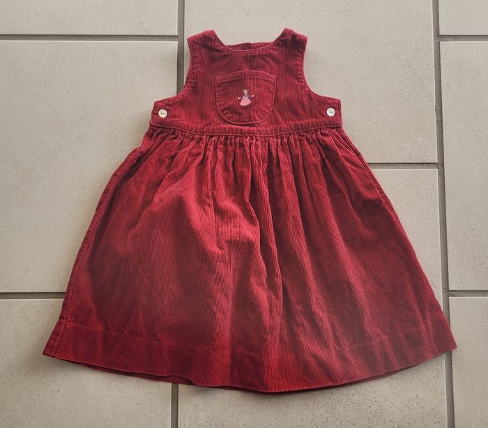 Robe en velours, de couleur rouge avec petit motif sur poche, de la marque Cyilllus, taille 24 mois (92 cm), en très bon état. Article lavé pour la vente.