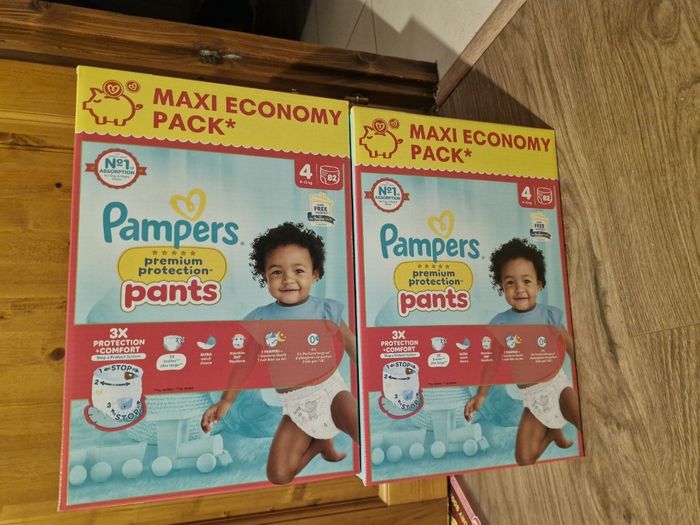 Bonjour, Je vends ces 2 paquets de couches pants pampers prenium en taille 4. Les paquets sont neufs jamais ouverts. Il y a 82 couches par paquets.