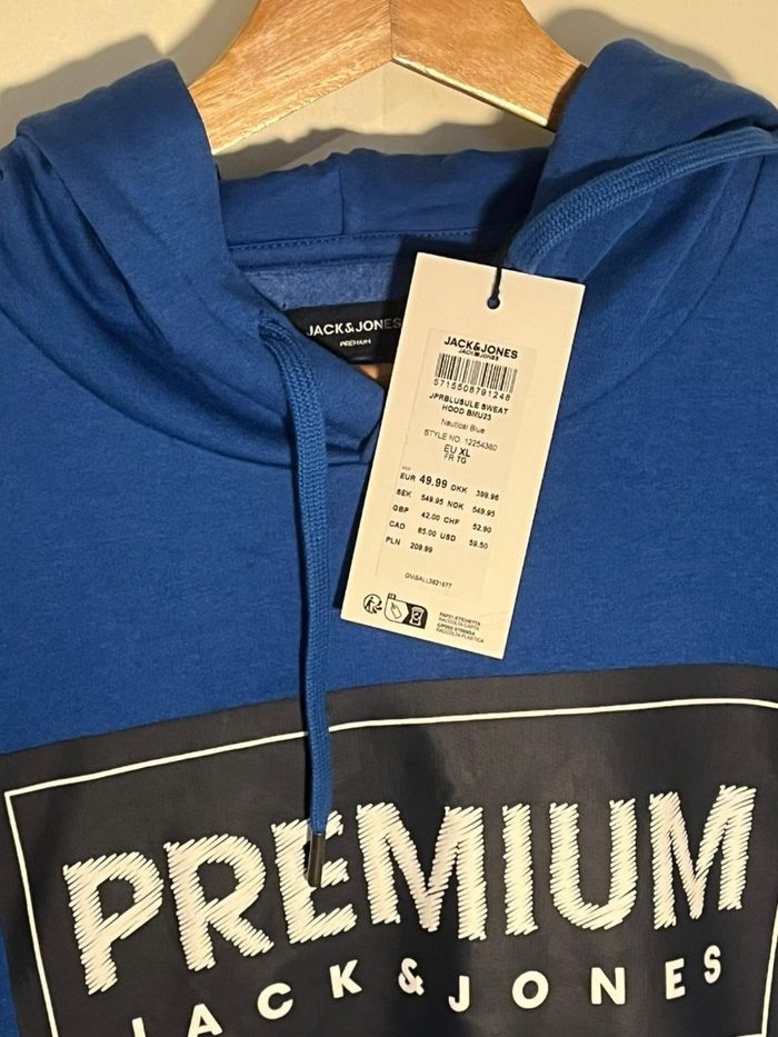 Sweat à capuche homme de la gamme JACK & JONES PREMIUM, modèle JPRBLUBOBLE SWEAT HOOD BMU23 en coloris Nautical Blue. Logo brodé en relief "PREMIUM JACK & JONES" sur fond noir. Coupe confortable, matière douce et épaisse, idéale pour l’hiver. Taille : XL (EU/FR) État : Neuf avec étiquette Prix boutique : 49,99€ Authenticité garantie