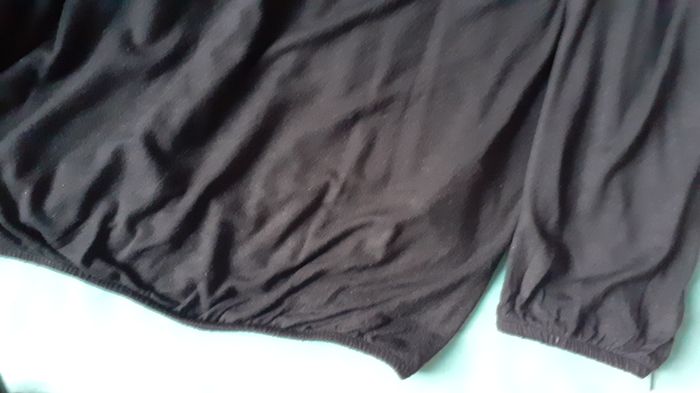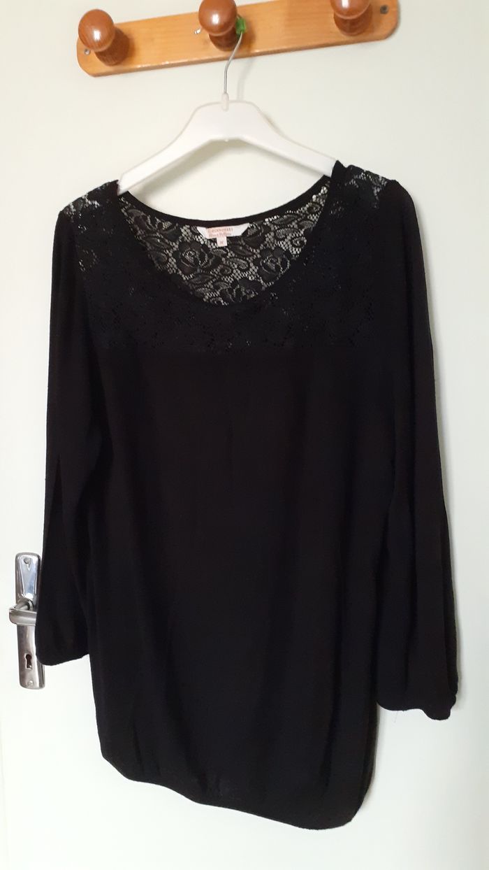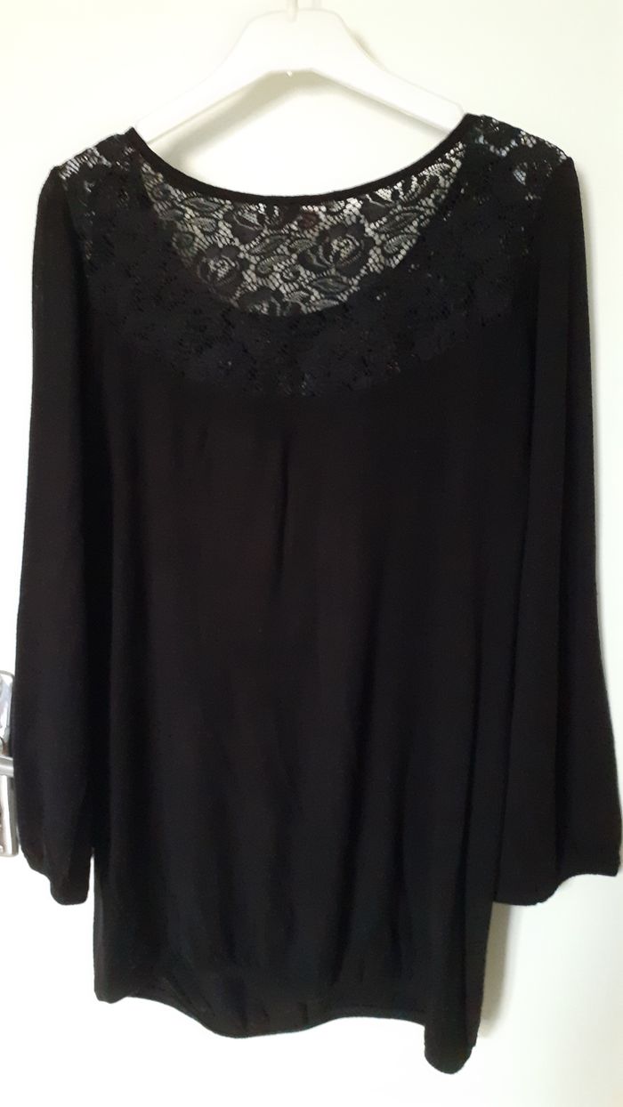 Vends un tee-shirt manches longues 92 % viscose, 8 % élasthanne, dentelle au niveau de l'encolure devant et derrière, élastique au niveau des poignets et à la base, couleur noir uni, marque Clokhouse, taille M. Longueur sous aisselle : 45 cm.
