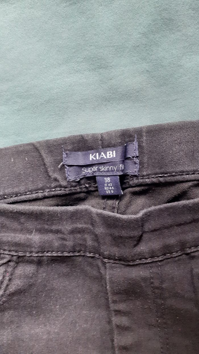Vends un pantalon noir 73 % coton, 25 % polyester, 2 % élasthanne, fausses poches devant, marque Kiabi super skinny, taille 38. Longueur entrejambe : 73 cm.