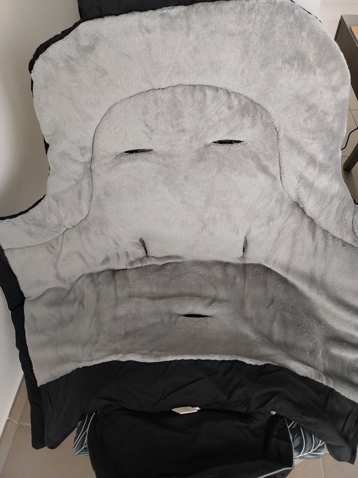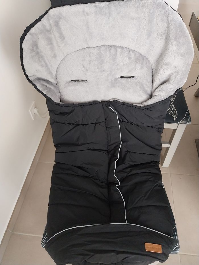 Chancelière de poussette avec 5 points d'attaches. Intérieur doux et chaud. Fermetures zippées.