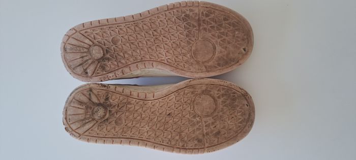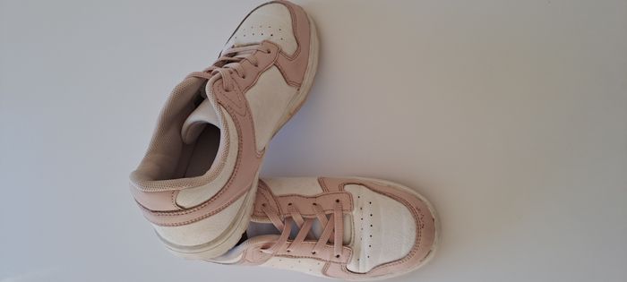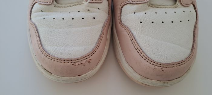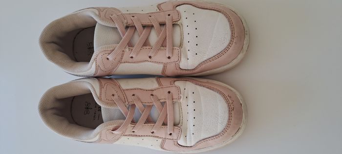 Adorables baskets rose poudré et blanc, parfaites pour le quotidien. Portées mais encore en bon état général (quelques légères traces visibles sur les côtés, voir photos), idéales pour l’école ou les sorties. Confortables et faciles à assortir Fermeture à lacets Pointure : 33