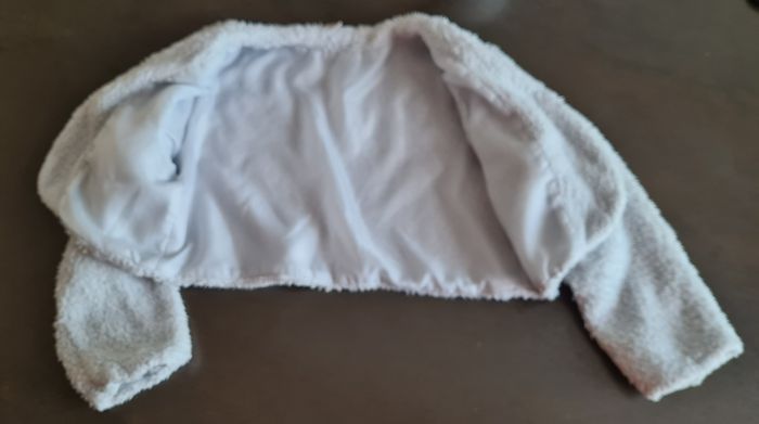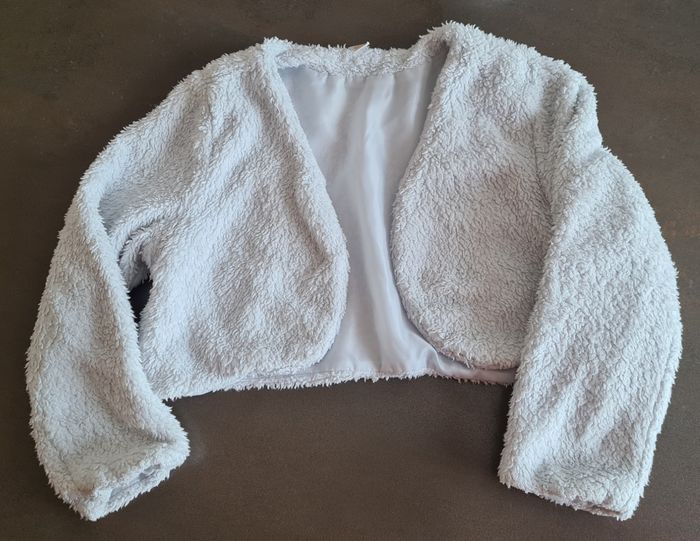 Veste boléro en fausse fourrure pour fille 6 ans - Veste chaude, moelleuse, ouvert sur le devant. Couleur gris très claire. La doublure a été recousue au niveau de la manche (voir photo), d'où le prix. Sinon en très bon état.