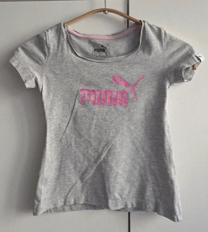 T-shirt Puma, manches courtes, taille 6 ans. Couleur gris, inscription en rose.