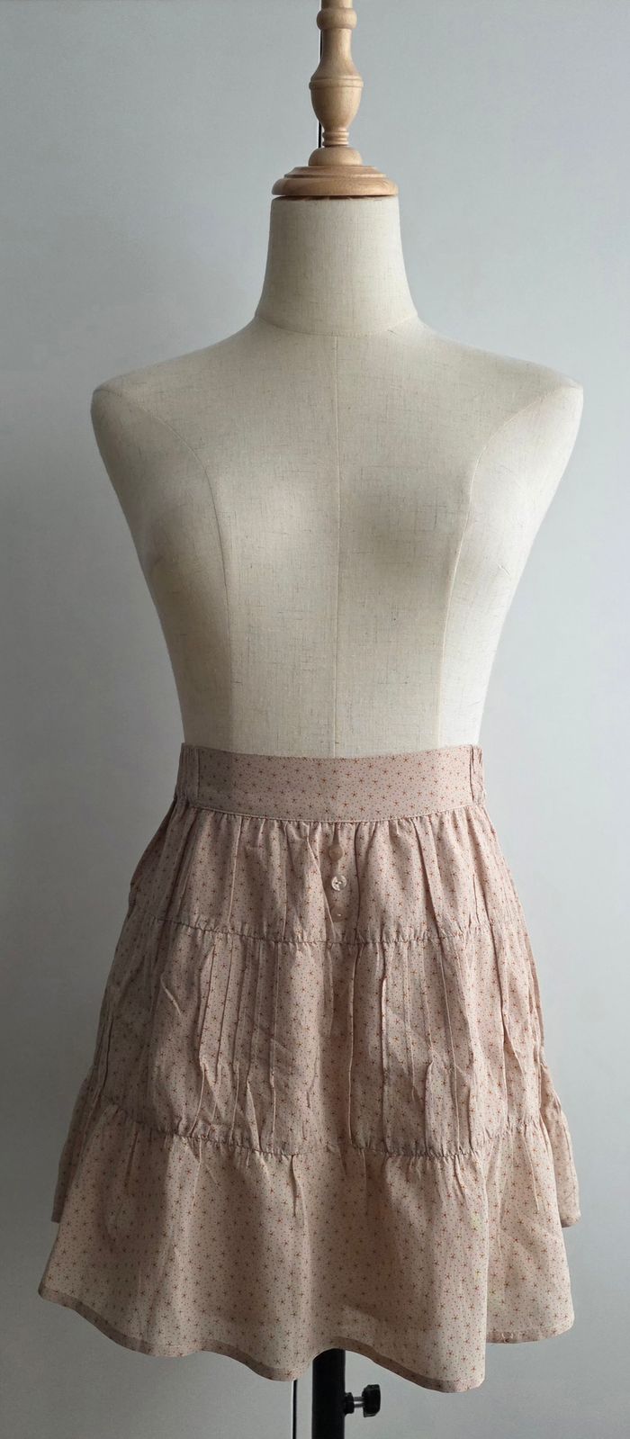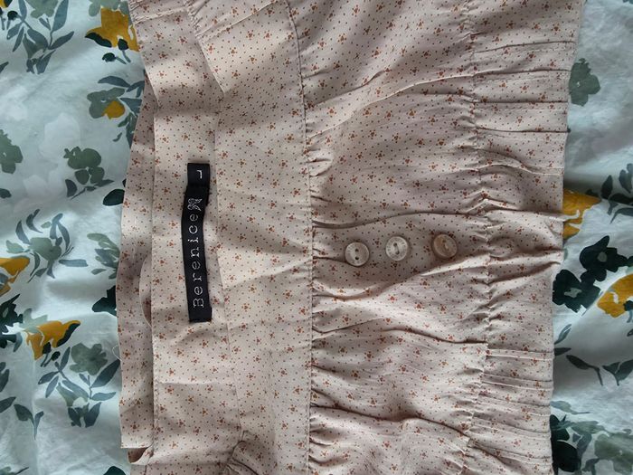 Jupe de marque Berenice, doublée, taille L, 55% viscose, 45% coton. Taille élastique, couleur beige, motifs orange, 3 boutons déco sous taille. Mesure taille: 40cm Longueur: 37cm