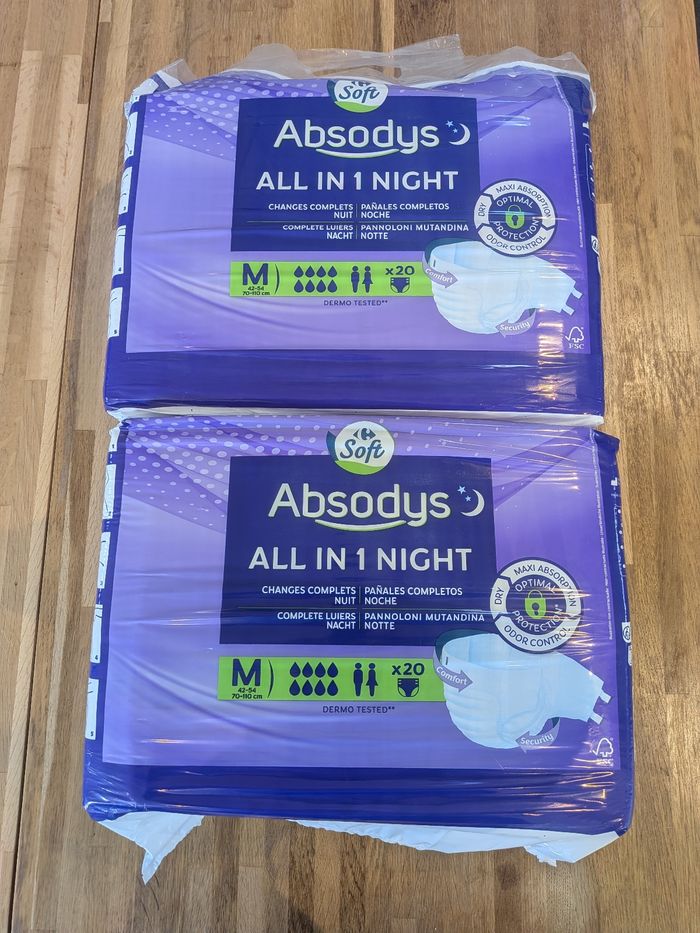Le lot de 2x20 soit 40 couches absodys de nuit adulte. Les paquets sont neufs et non ouverts.