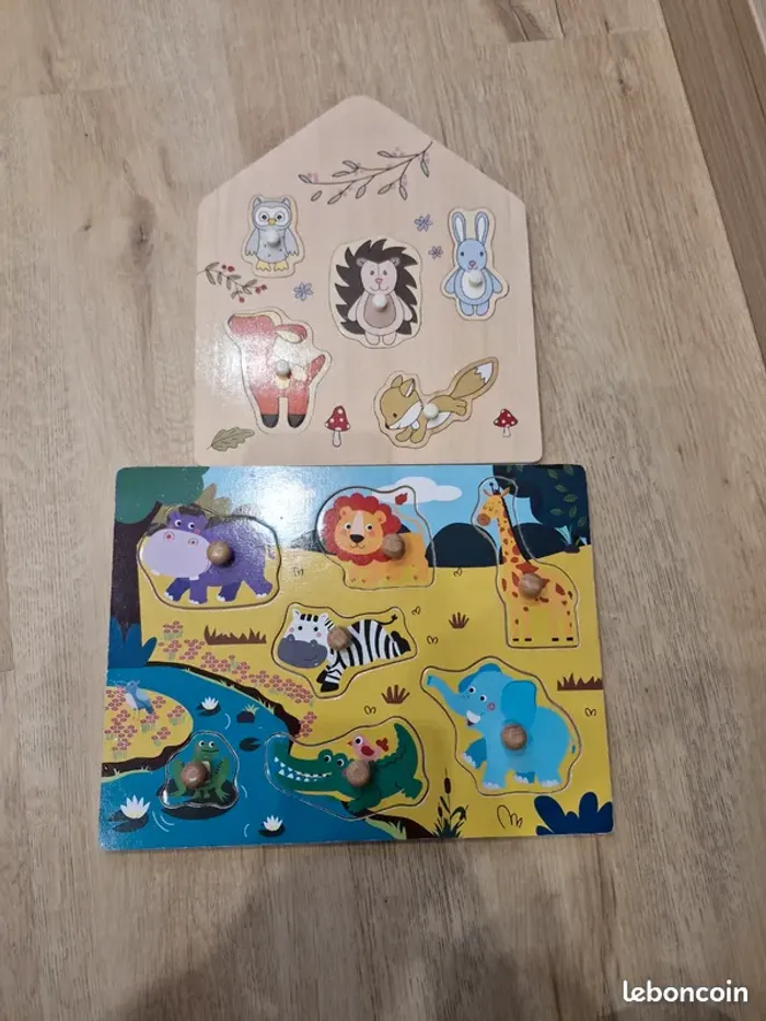 Lot de 2 puzzles en bois l’un acheté chez auchan et l’autre fabriqué en Allemagne. 3€ le lot possibilité de venir récupérer à Villeparisis 77270