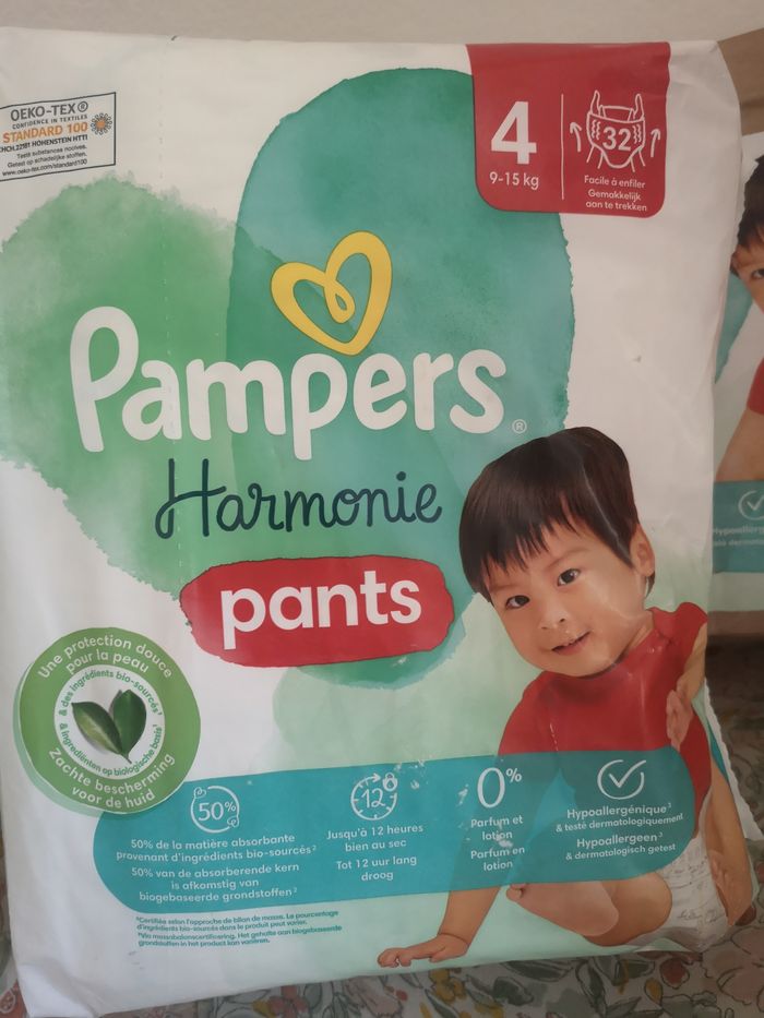 Lot de 2 paquets de 32 pants pampers harmonie taille 4, soit 64 pants. Taille 9 à 15kg. Taille correctement. Couches saines et respectueuses de la peau de bébé. Ne laisse pas de reaches sur la peau.