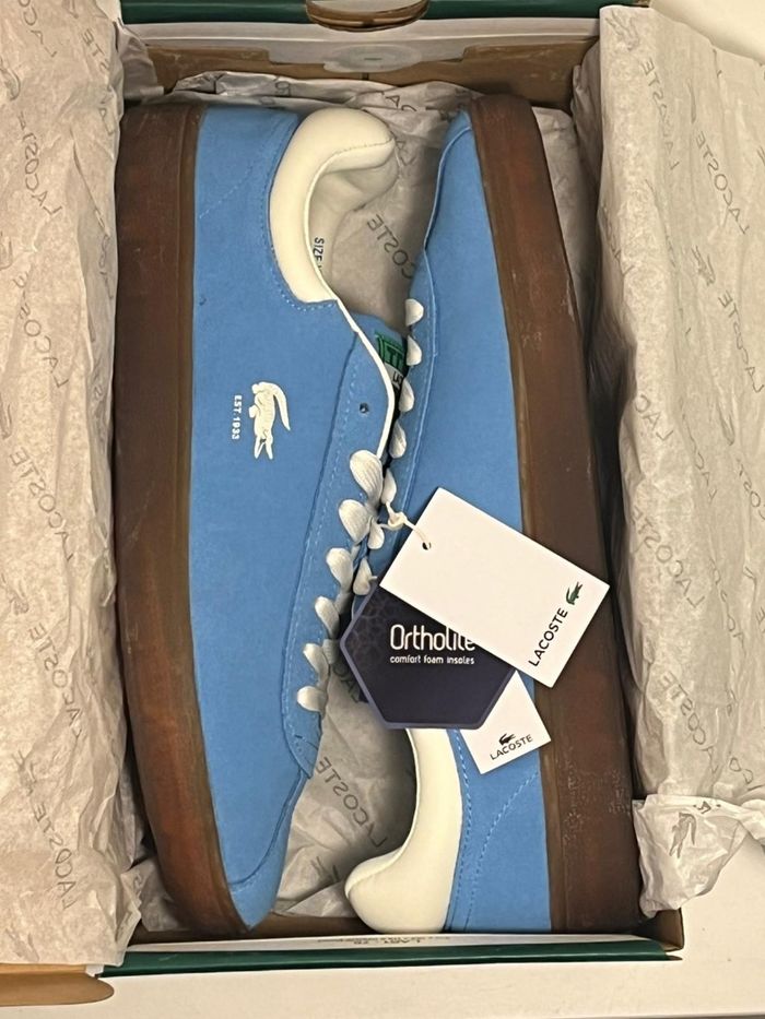 Basket Lacoste originale en taille 40,5, coloris bleu marine avec semelle marron, lacets blancs et doublure intérieure blanche. Détails soignés : logo crocodile brodé, inscription "EST. 1933", languette marquée "TENNIS". Semelle intérieure Ortholite® pour un confort optimal. État neuf avec étiquettes, incluant label éco-responsable et QR code d’authenticité. Style premium, idéal pour un look casual ou sportif