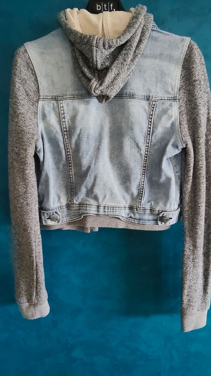 Veste en jean courte avec bras et capuche en tissu. Capuche amovible, vraies poches, effet usé à certains endroits Pas de tâche, ni de trou Longueur environ 43 cm #thethe27femme38 #thethe27femme40