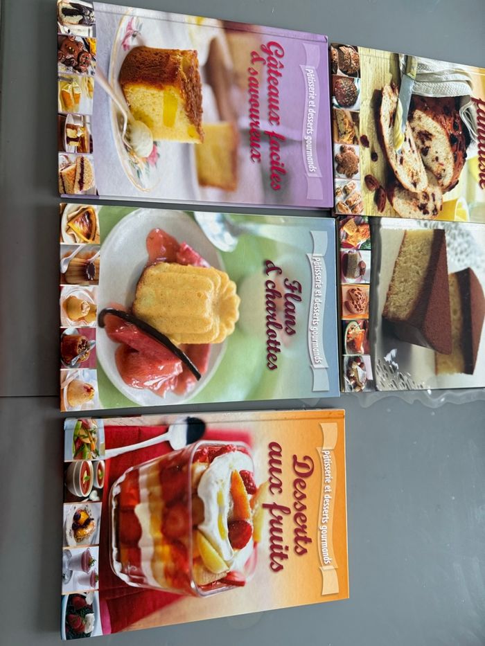 Lot de 5 livres de cuisine gourmande Femme Actuelle - 1 livre Gâteaux faciles et savoureux - 1 livre Gâteaux délicieux et inratables - 1 livre Flans et charlottes - 1 livre Desserts aux fruits - 1 livre pains fantaisie Tous en très bon état