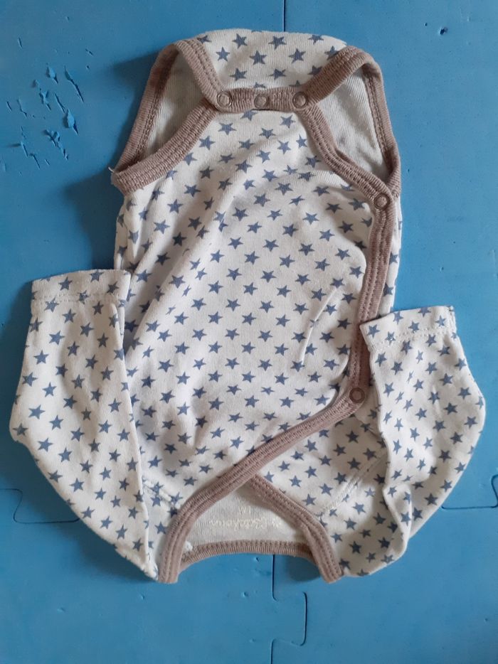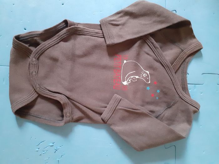 Vends lot de 3 body manches longues, 1 mois. Celui avec des étoiles est de marque Kitchoun, celui avec un ours est de marque Petit Bateau, le rayé est de marque Grain de blé (il est en très bon état)