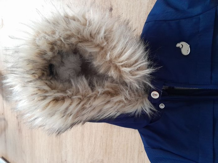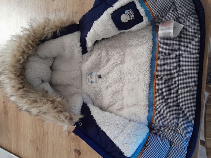 Je vends cette parka d'hiver pour bébé de 12 mois de la marque Sergent Major. - Type de produit : Manteau parka - Taille : 12 mois / 80 cm - Marque : Sergent Major - Couleur : Bleu marine avec doublure fourrure synthétique. - Caractéristiques : Capuche, 2 poches.