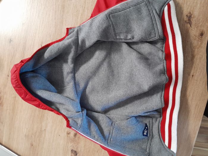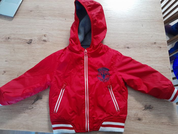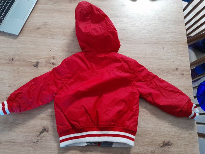 Je vends cette veste réversible mi-saison pour bébé de 24 mois. - Type de produit : Blouson réversible - Taille : 24 mois / 92 cm - Couleur : Rouge d'un côté, gris de l'autre. - Caractéristiques : Capuche, fermeture zippée, 2 poches de chaque côté.