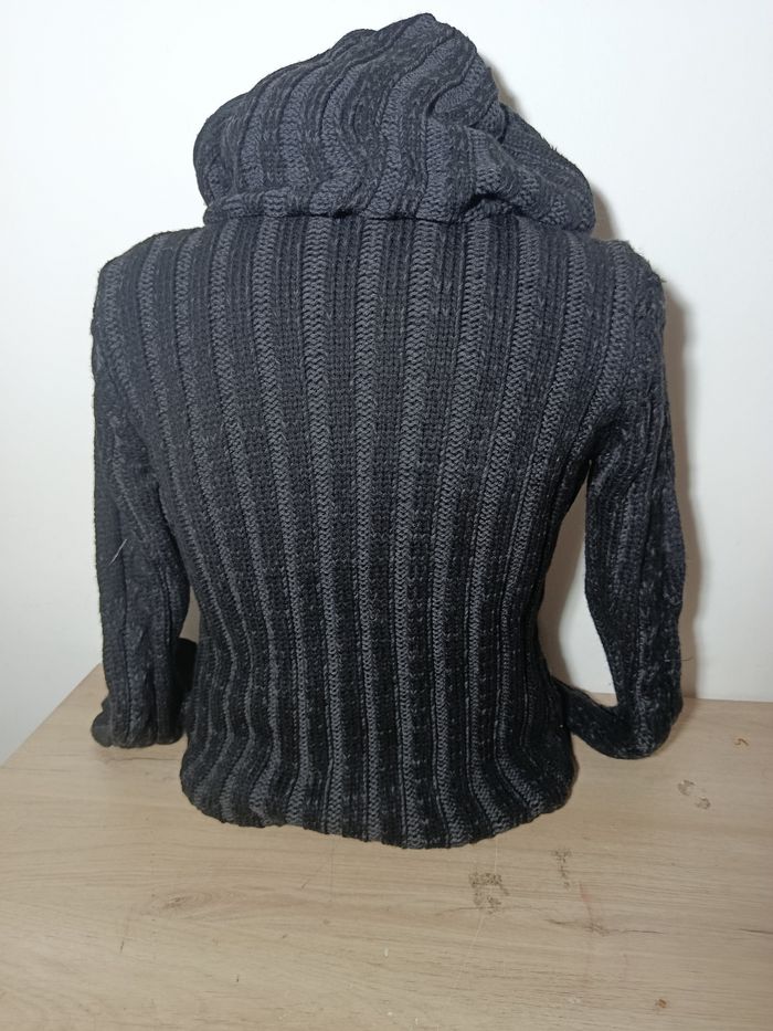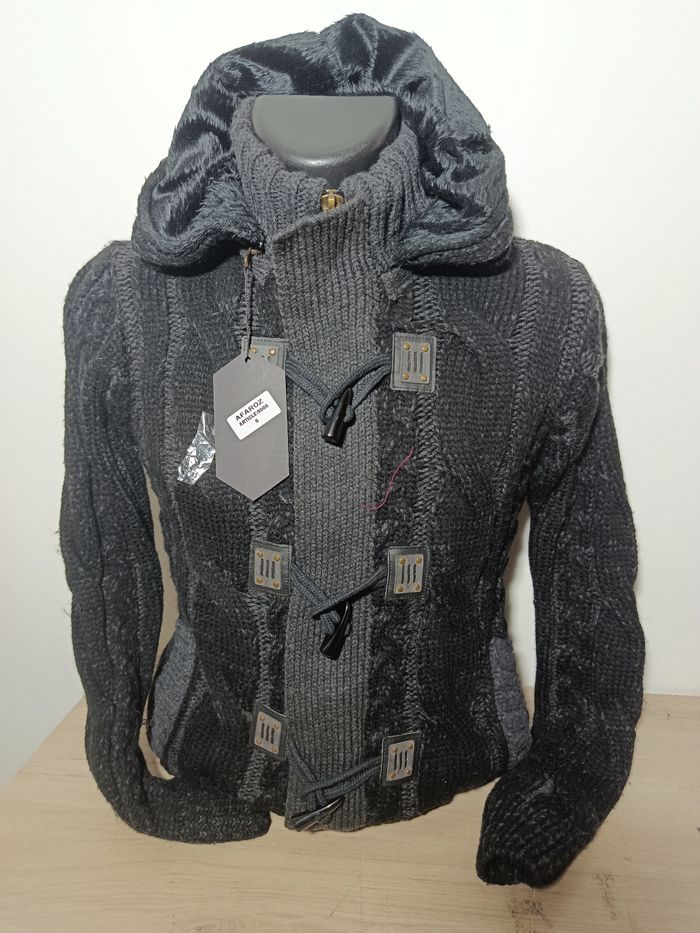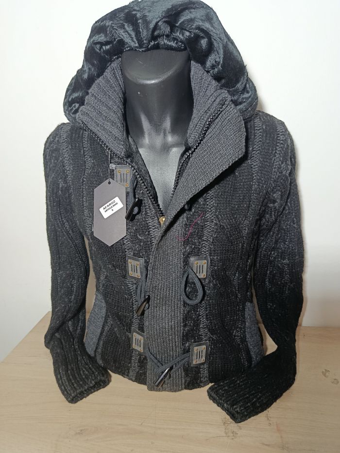 Gilet doublé avec capuche amovible ,grosse maille ( coton et laine ) extensible et lavable en machine à 30 ° .