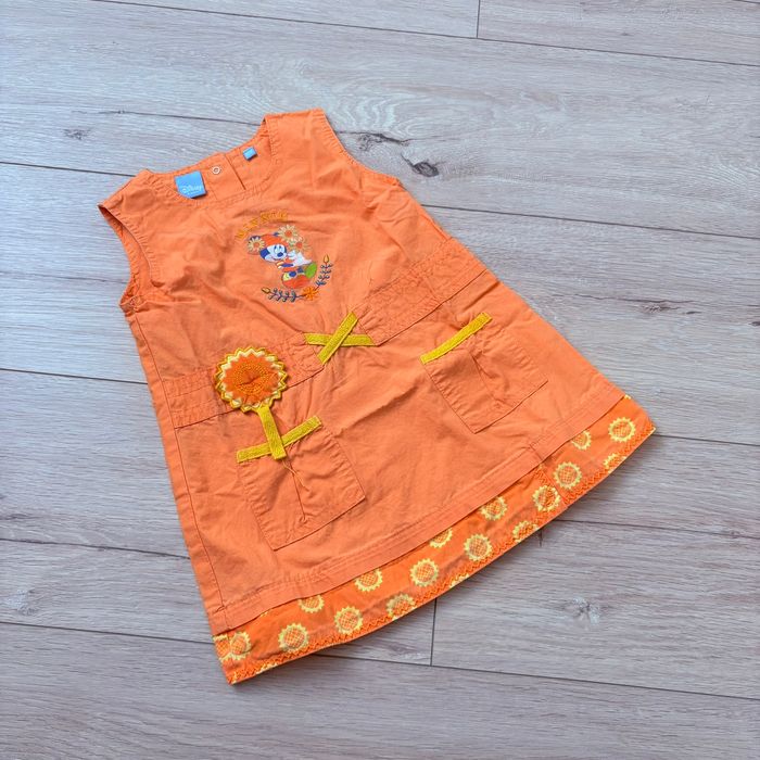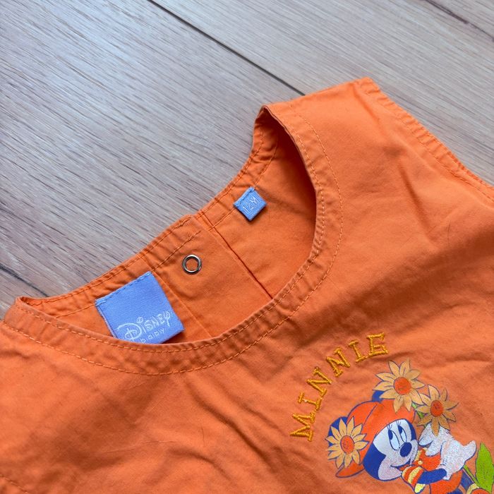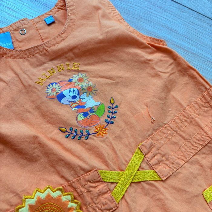 Robe fille Disney Baby, taille 12 mois, coloris orange avec motif Minnie et détails fleurs Très mignonne pour l’été À noter : petit accroc discret (voir photo), reste en très bon état Envoi rapide et soigné