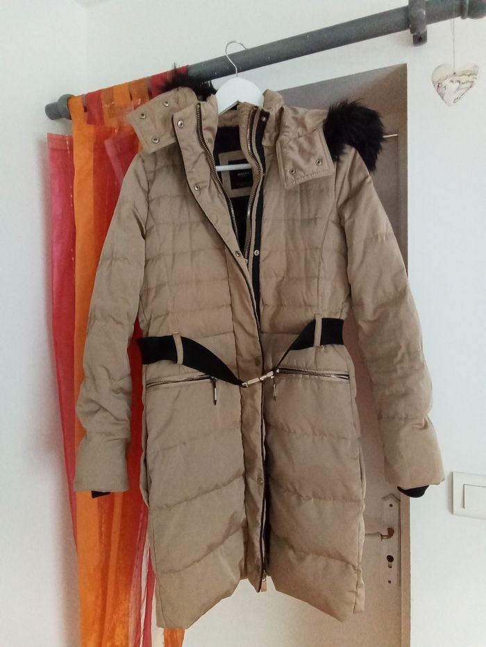 🌺 Jolie doudoune marron longue chaude et confortable 🌺 Capuche amovible avec zip et fourrure 🌺 Ceinture avec élastique et clip de fermeture (l'élastique s'est un peu relâchée mais ne gêne en rien sa mise en place) 🌺 Fausses poches devant et poches latérales avec bouton pression (Couture de consolidation, voir photos) 🌺 Fermeture par zip et bouton pression 🌺 Mesures prises à plat : Hauteur totale : 92 cm Largeur épaules : 41 cm Longueur manches : 67 cm 🌺 92% polyester 8% polyamide Rembourrage en plumes de canard (Léger accroc dans la doublure) 🌺 Manteau très agréable à porter 🌺 Taille 36