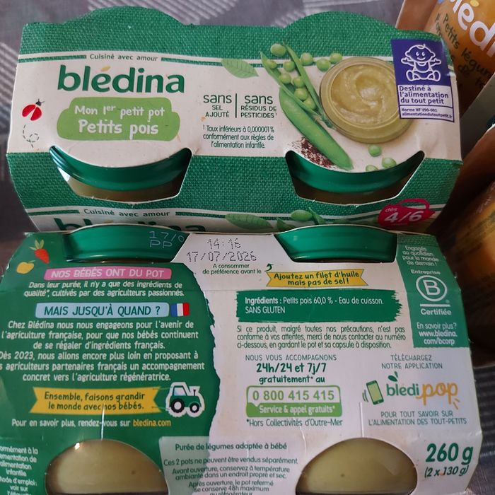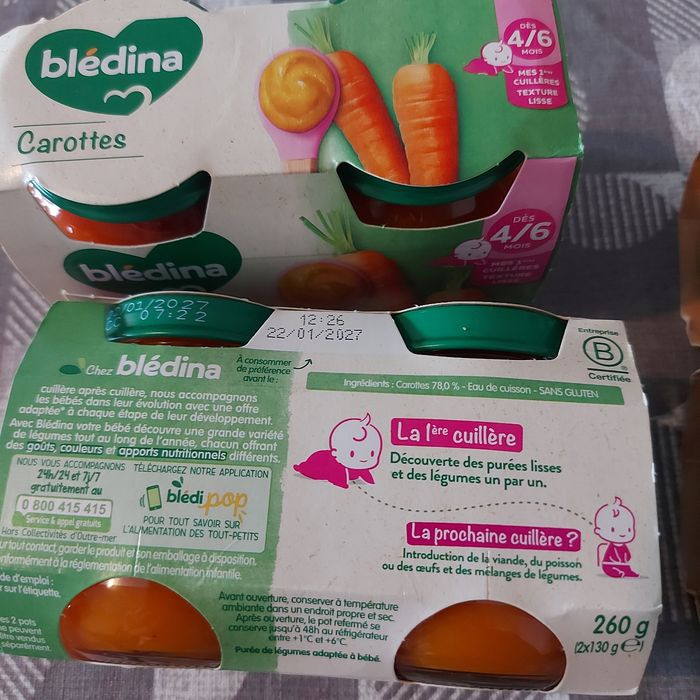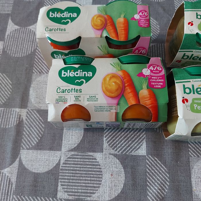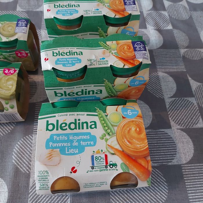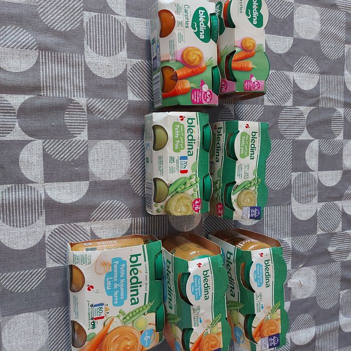 Lots neuf date de peremption bonne ! 3 paquet grand pots a partir de 6 mois petit legume/pomme de terre/lieu Puis 2 paquet petit pots a partir 4 mois petit pois Et 2 paquet petit pots a partir de 4 mois carotte