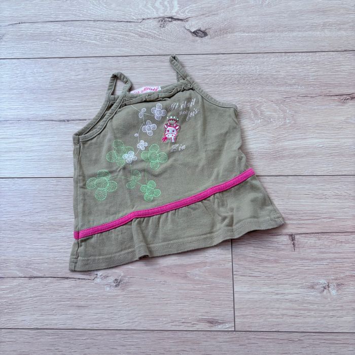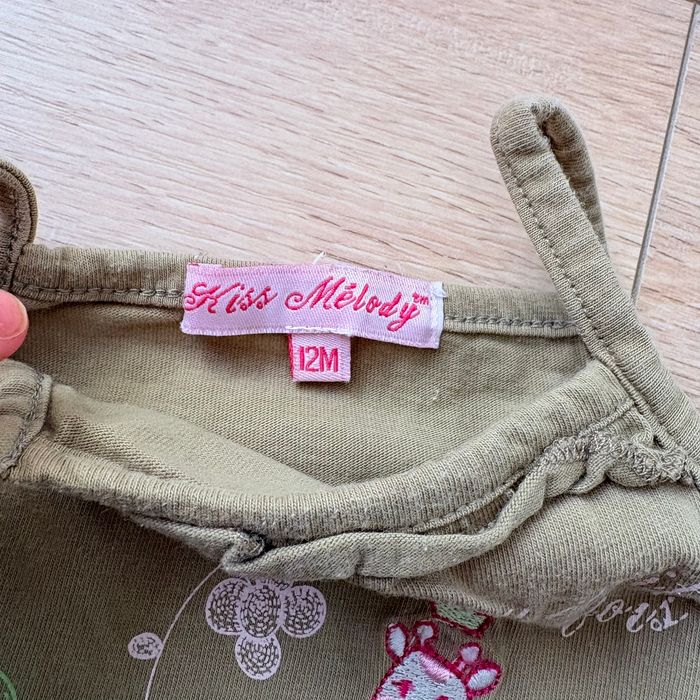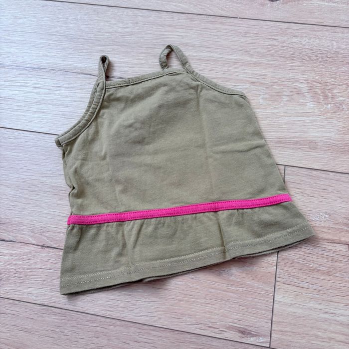 Débardeur fille Kiss Melody, taille 12 mois. Coloris kaki avec bande rose et joli motif fleuri + girafe. Très bon état Bretelles fines, parfait pour l’été