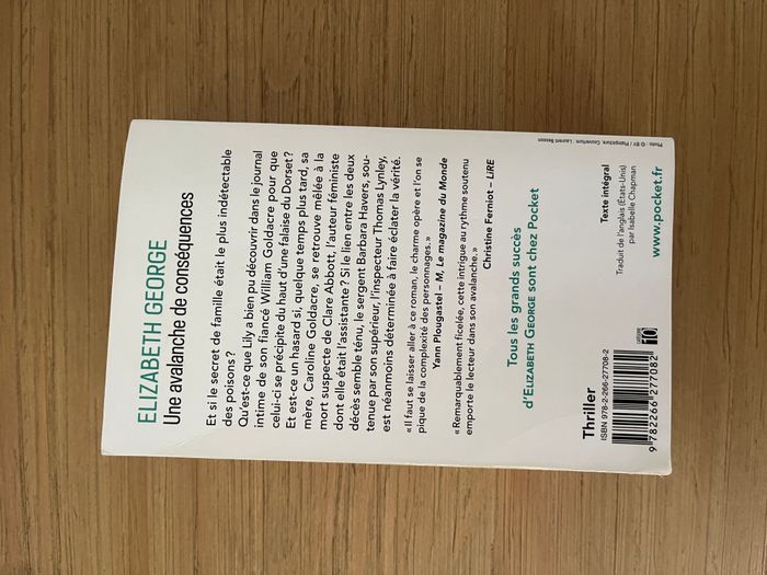 Livre de poche épais, pas tout jeune mais reste en bon état. Peut encore largement être lu Et si le secret de famille était le plus indétectable des poisons ? Qu’est-ce que Lily a bien pu découvrir dans le journal intime de son fiancé William Goldacre pour que celui-ci se précipite du haut d’une falaise du Dorset ? Et est-ce un hasard si, quelque temps plus tard, sa mère, Caroline Goldacre, se retrouve mêlée à la mort suspecte de Clare Abbott, l’auteur féministe dont elle était l’assistante ? Si le lien entre les deux décès semble ténu, le sergent Barbara Havers, soutenue par son supérieur, l’inspecteur Thomas Lynley, est néanmoins déterminée à faire éclater la vérité.