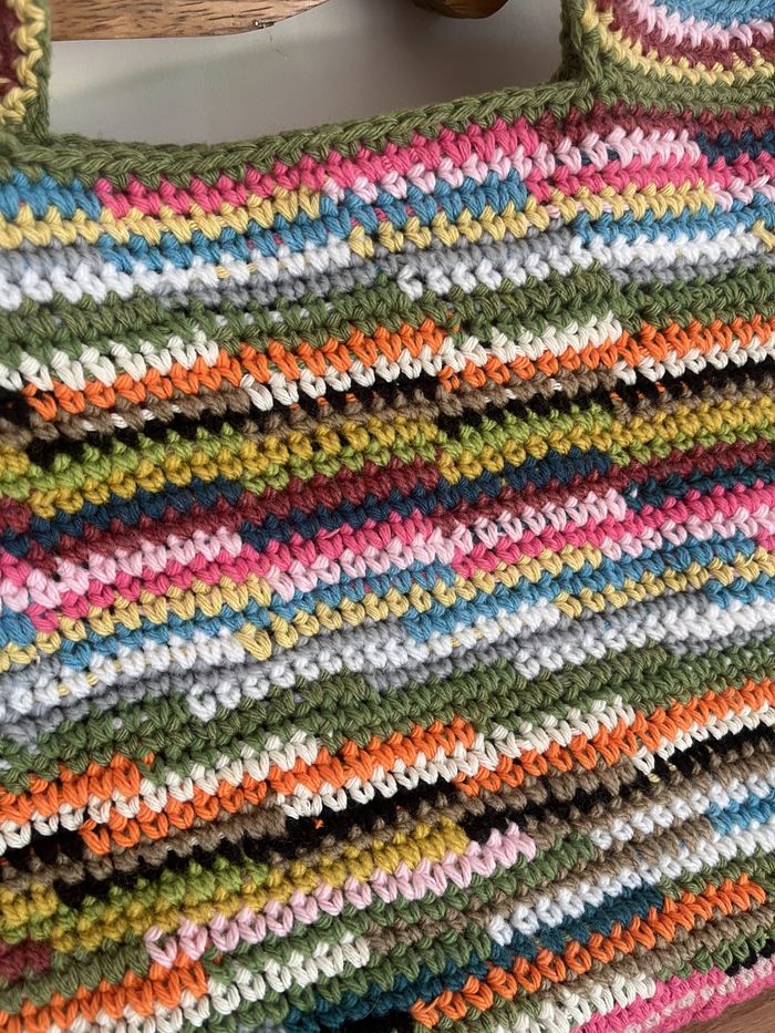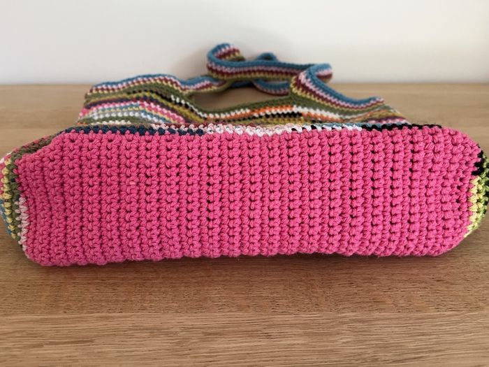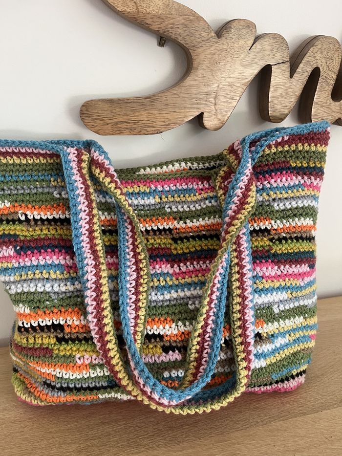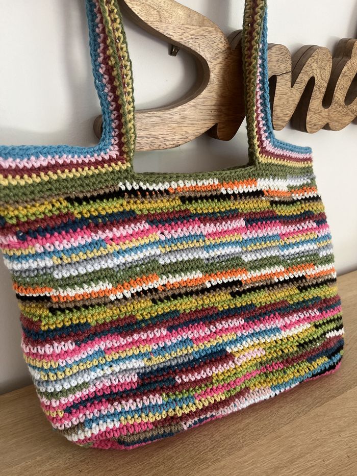 sac cabas fourre tout fait à la main au crochet avec un mélange coton et acrylique. multicolore il s'adaptera à toutes vos tenues. dimensions : largeur 33 cm (13 pouces) hauteur 24 cm (9,5 pouces) longueur des anses 63 cm ( 25 pouces)