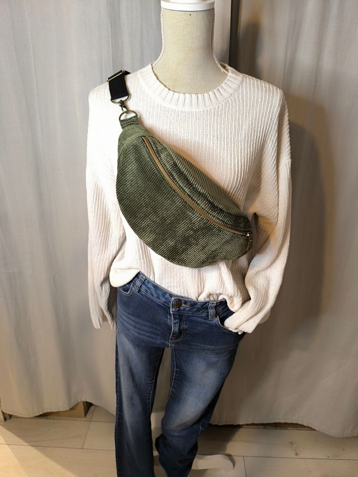 Dimensions : environ 35 x 15 cm Extérieur : velours doux et résistant Intérieur : entièrement doublé en coton Fermeture zippée solide Sangle réglable Pratique et confortable, elle permet d’emporter l’essentiel au quotidien tout en apportant une touche bohème et élégante à vos tenues 🌸 Pièce unique, idéale pour un cadeau ou pour se faire plaisir.
